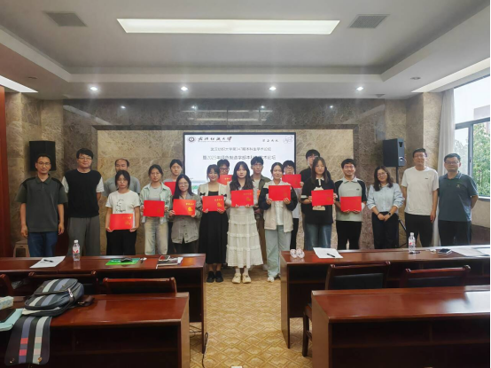 12302何雨婷同学介绍了项目磷离尽致﹣多源固废基可除磷护坡单元的关键制备及运用;生物工程12302胡顺同学介绍了项目码护舌安﹣3D打印三键超级拉曼码用于食品/药品溯源与防伪;纺织公司黄嘉琪同学介绍了项目智慧城市纱线基智能水泥复合材料;环境科学12201刘芷怡介绍了项目铁基调理剂耦合微生物协同修复镉铬污染土壤的界面调控机制;应用化学12301覃妹彤同学介绍了项目亚稳态催化剂突破尿素氧化能垒瓶颈赋能绿色转化;化妆品12202陶冰珊同学介绍了项目智能突释一酸响应绿原酸双层微球的制备及应用;高分子12301王润之同学介绍了项目"纤纸绝缘"﹣聚苯硫醚超细纤维复合芳纶绝缘纸;环工12302吴家辉同学介绍了项目磁碳先锋:磁性多孔碳吸附﹣氧化﹣资源化三位一体驱动抗生素废水高效净化技术;化工12301余梦云同学介绍了项目氢键调控多糖长余辉磷光用于湿度传感的研究;生物工程12301张杰灵同学介绍了项目人雄激素源性脱发治疗;生物工程12302张向楠介绍了项目生物质基席夫碱增强环氧树脂抑烟性能和机械性能;高分子12201周成同学介绍了项目"雾遁卫士"-国内生物质类流体防雾剂开拓者;轻化12201同学周燕霞介绍了项目如虎添翼﹣光热双隐身织物的设计与开发。各位同学汇报结束后,评委老师就项目内容与汇报的同学进行了交流,对各个项目进行了细致的点评指导。交流结束后,评委老师为参与汇报的同学颁发证书并合影留念。