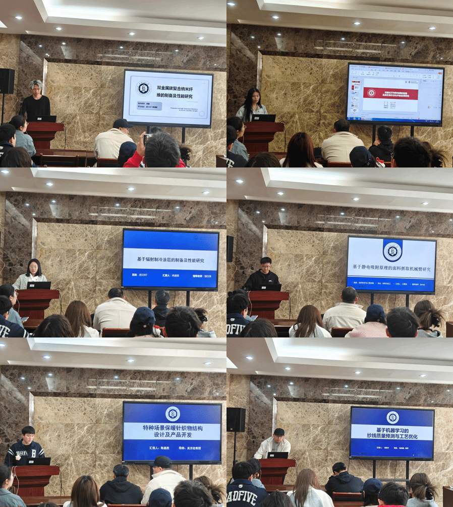 论坛上,李泽辰、伍志喜、冉淑贤、王善滋、陈鑫胜、刘浩宇六位同学依次介绍了自己的研究课题和目前取得的研究进展,并分享了自己的科研经验。主讲同学的研究课题包括双金属碳复合纳米纤维材料及其性能研究、功能化不对称性膜的制备及其在海水淡化的应用、辐射制冷涂层的制备及性能研究、基于静电吸附原理的面料抓取机械臂研究、特种场景保暖针织物结构设计及产品开发、基于机器学习的纱线质量预测与工艺优化,契合了“纺织新材料及绿色加工”主题,代表了公司最新研究进展,参会人员积极提出问题和建议,营造了良好的学术氛围。