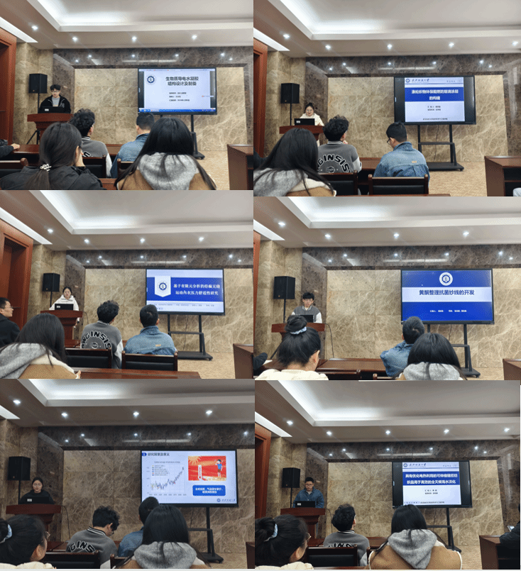 论坛上,王蒙召、赖嘉馨、高雅、侯林松、刘 洁、陈 斌、何承洋七位同学依次介绍了自己的研究课题和目前取得的研究进展,并分享了自己的科研经验。主讲同学研究课题包括,生物质导电水凝胶结构设计及制备、涤纶织物环保阻燃防熔滴涂层的构建、基于有限元模型的经编运动内衣压力舒适性研究、功能纺织品的制备及研究、纤维素基辐射制冷膜的制备及其性能研究、具有优化电热利用的可伸缩缝纫纺织品用于高效的全天候海水淡化、舒适型高性能防切割面料制备技术。契合了“纺织新材料及绿色加工”主题,代表了公司最新研究进展,参会人员积极提出问题和建议,营造了良好的学术氛围。