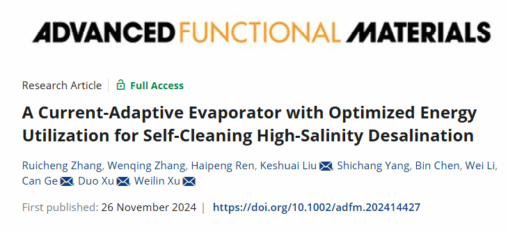 best365英国体育在线刘可帅课题组在国际著名材料期刊《Advanced Functional Materials》上发表了题目为“A current-adaptive evaporator with optimized energy utilization for self-cleaning high-salinity desalination”的研究成果。论文的第一署名单位为best365英国体育在线,纺织科学与工程专业22级研究生张瑞成为第一作者,纺织科学与工程专业23级研究生张文清为共同第一作者,刘可帅为论文的第一通讯作者。