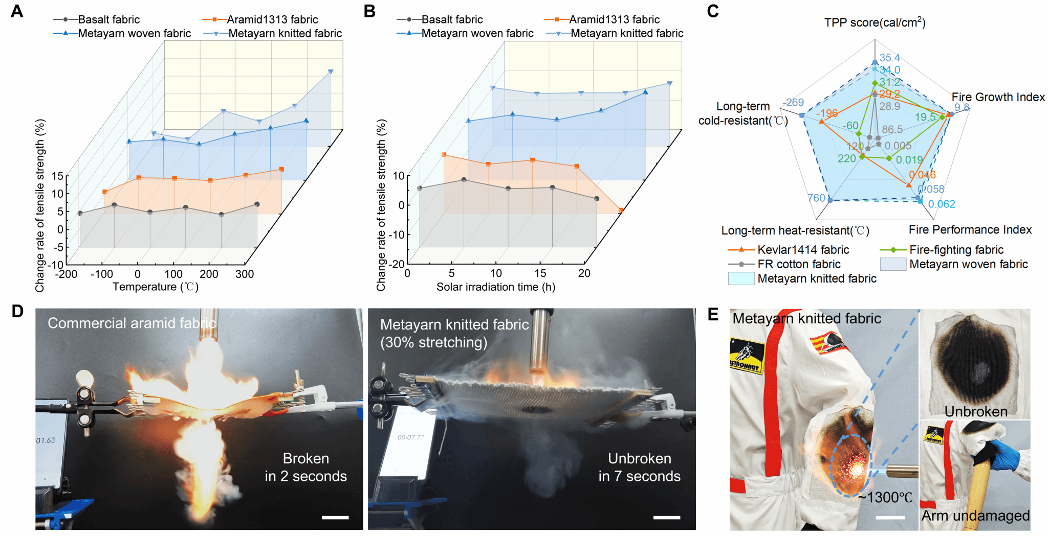 徐卫林、夏治刚、陶光明教授带领尚路路、徐傲、张世亮等研究生,针对当前技术持续改进创新,首创“coaxial spiral wrap spinning”技术,突破了无损低扭成纱、多层级稳态包覆等关键技术与装备创新,工业化实现了多层级、有机无机复构的亲肤柔韧型玄武岩超结构纱线(Metayarn)批量化连续生产。所生产的Metayarn纱强度较原玄武岩长丝提升27.76%,成纱残余扭矩较其他商用纱线大幅降低,可直接针织或机织加工生产出亲肤柔性Metayarn制品。面向航空航天复杂极端环境,Metayarn制品展现出卓越的环境适应性与结构稳定性。柔韧性制品在−200℃液氮、300℃热风持续冲刷以及强太阳辐照长时间照射等条件下,其强度不仅未发生衰减,反而有所提升;在1300℃火焰灼烧后仍能保持结构完整。同时,MetaYarn针织制品具备高达421%的断裂伸长率,在30%拉伸状态下仍能保持优异的阻燃与抗火性能,实现了“舒适-防护”一体化功能。