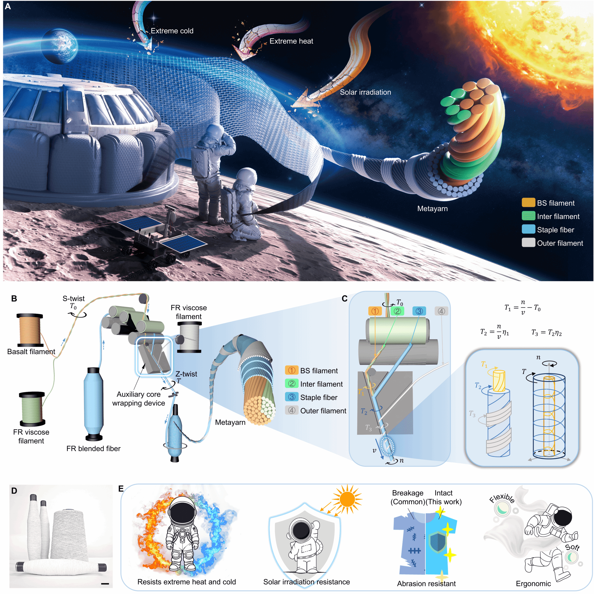 近日,纺织新材料与先进加工全国重点实验室徐卫林院士团队夏治刚教授课题组联合陶光明教授(国家杰青),在Matter期刊发表题为“Hierarchical basalt metayarn for ergonomic protective space textiles”的研究论文(论文连接:https://doi.org/10.1016/j.matt.2025.102481)。该纺纱新材料与先进加工课题组首次提出了卷芯纺纱技术“coaxial spiral wrap spinning”,解决了玄武岩纤维在超细尺度下无损、低扭、高品质、批量化纺纱、织造、服用难题,为高刚高脆无机纤维材料的大规模亲肤柔韧型纺织加工开辟了新途径,可批量化满足航空航天领域对高性能防护材料抵御复杂极端环境的迫切需求。论文第一作者为夏治刚教授,通讯作者为徐卫林院士、陶光明教授(国家杰青)。