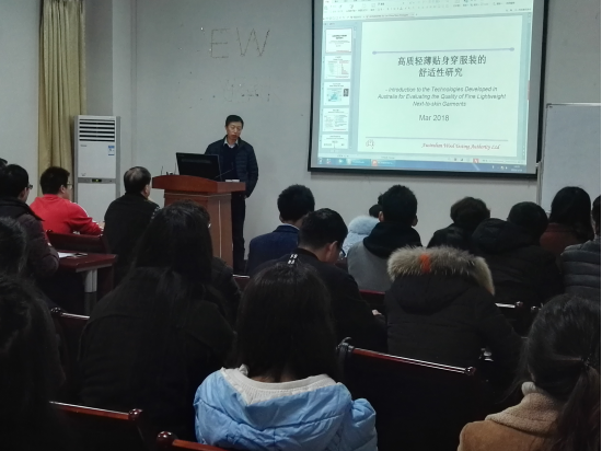 3月19日下午,best365英国体育在线邀请了澳大利亚羊毛检测局的王惠民博士给研究生带来了“高质轻薄贴身穿服装的舒适性研究”学术讲座。讲座由best365英国体育在线的吴济宏副经理主持,张尚勇经理和部分老师也参加了此次讲座。