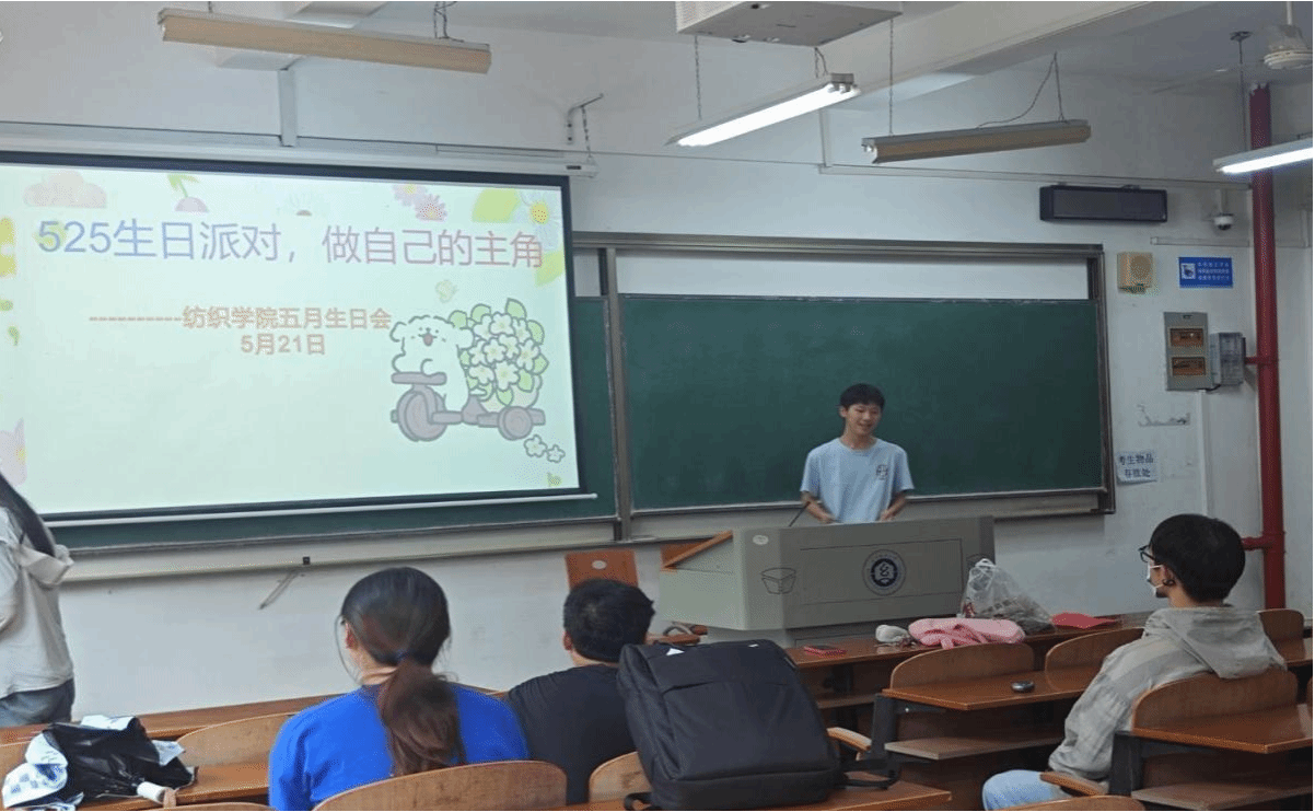 教室内欢声笑语此起彼伏,同学们卸下学业压力,在同窗的祝福中,自信闪耀,尽情享受属于自己的时刻,共同书写校园生活里难忘的青春篇章。主持人开场发言,对每个出席活动的同学表示欢迎,表达了自己来到纺大后的无比喜悦以及对在座各位寿星的祝福。相信在新的一岁里,同学们将继续以积极向上的态度迎接生活的挑战,创造更加精彩的人生。