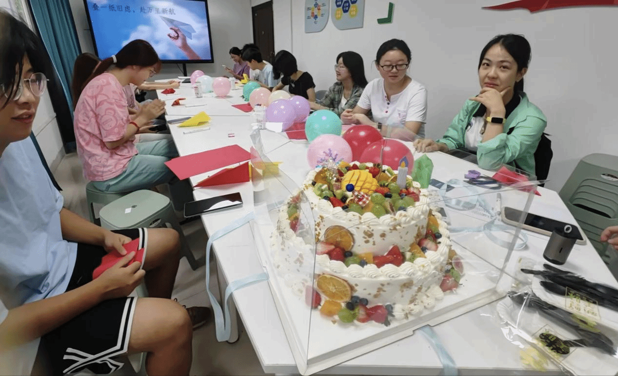 暖场环节中,一场别开生面的折纸活动掀起热潮。同学们动手折纸飞机,放飞烦恼,迎接未来,一张张彩纸在指尖化作心意满满的礼物。大家相互交流技巧,笑声此起彼伏,简单的折纸不仅锻炼了动手能力,更拉近了彼此距离。随后,大家共同唱起了《生日快乐》歌,在场的老师和织心湾的工作人员们为六月份生日的同学们送上生日祝福。几位寿星代表上前许愿,最后大家一同分享美味蛋糕,甜蜜在舌尖蔓延,幸福在心中流淌。