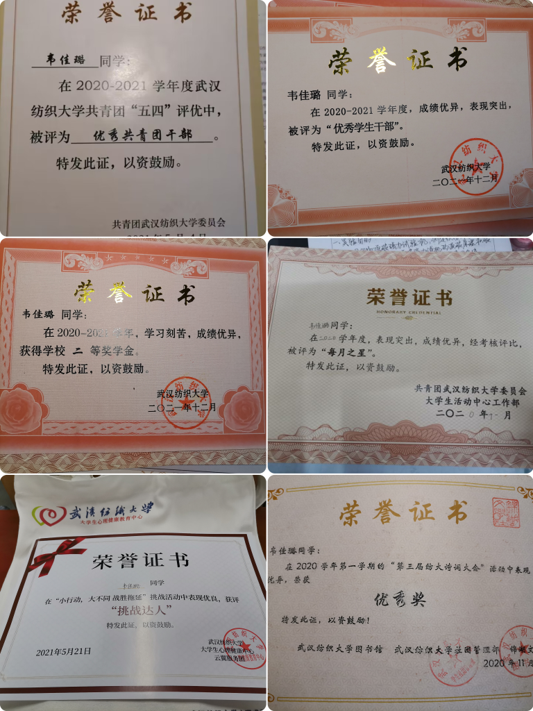 她担任班级团支书期间,积极配合上级团委工作,负责团日活动的策划,从方案的设计到活动的实施,再到后期进行活动总结,她尽心尽力,用心组织每一场活动。她带领非织12002班获评校级“五四红旗团支部”和“活力团支部”。大家都看到了她的能力和付出,她于2022年度的“五四”表彰中获得“校级优秀共青团干部”荣誉称号,连续两年被评为“优秀员工干部”。在她看来,这是组织和同学对她担任团支书工作的肯定,今后会更加勤勉,用心服务好班级同学。与此同时,她主动担任锦湖文学社社长,带领社团组织并承办了校园诗词大赛、校园“三行情诗”比赛等20场独具特色的活动,到梦空间发布活动50+次,校内参与人数高达1000+次。在大学期间,她还担任新生班助,做好学弟学妹初入校园的领路人;参加第五届员工代表大会,充分发挥了民主管理的权利和义务,加入老员工活动中心工作部校级组织,工作勤恳被评为“每月之星”。