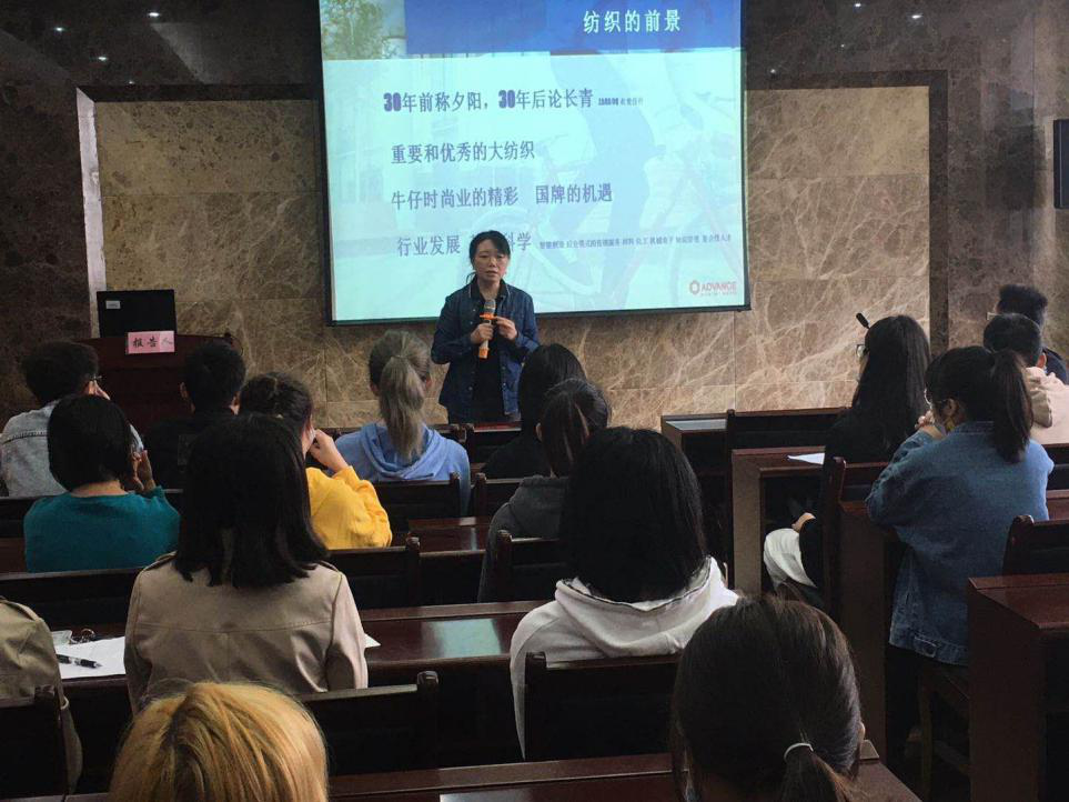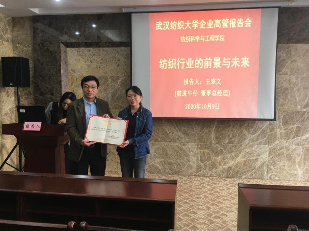 王总经理向同学们详细介绍了牛仔时尚行业的发展现状,并结合自身经验,深入分析了牛仔时尚行业的未来发展和创新方向,为同学们开拓了视野,增长了见识。同时,王总经理从核心价值、研发创新、客户资源三个方面介绍了公司风采,展示了企业实力,并分享了个人成长经历及成就,在最近2020年的全球Rivet 50牛仔行业前50名影响力人物评选中当选,此评选的50名含设计师、品牌主、商业领袖和服装、面料及原材料制造企业的专家,王总经理是迄今入选唯一的中国人。报告结束后,张经理向王总经理颁发了客座教授的聘书。