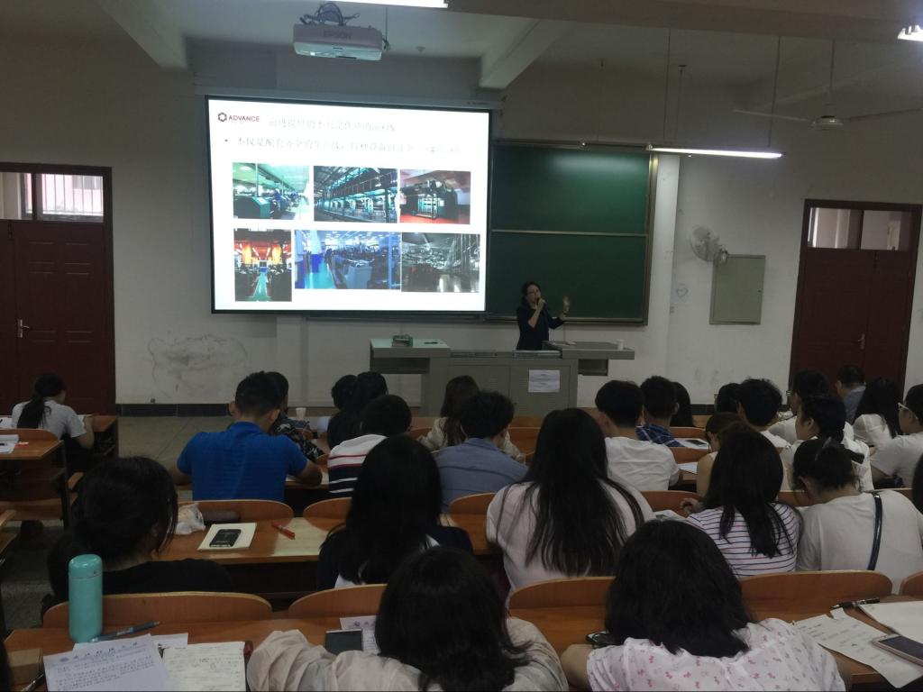 王宗文女士1993年从公司毕业之后就进入广东前进牛仔公司,从基层一线做起直至今日。王女士用自己二十多年来的前身经历来讲解,我们应该如何去选择未来,如何去选择平台。告诫我们要干一行爱一行,要对事情保持专注,不要三心二意,要坚持纺织行业,从基层做起,其中大有作为。王宗文女士十分风趣幽默,不时博得同学们的掌声和笑声。