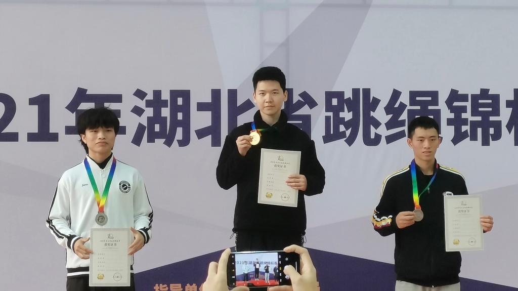 2021年,郭世贸同学再度出征省跳绳锦标赛,为了进一步提高成绩和卫冕自己的荣耀,他执行了更加严苛的训练计划并坚持到比赛前一天,因为他深知真正的赛场是多么的激烈和残酷。也正是因为这份来自他内心的韧劲和忍劲使得他再一次打破自己创下的赛会纪录并拉大与其他选手的差距,又一次站在了赛会的最高领奖台上。
