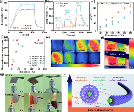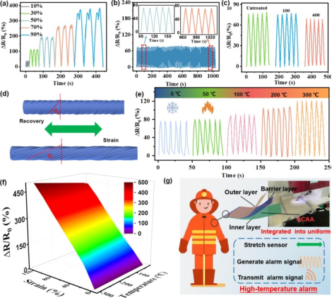 所得的纱线传感器具有独特的高伸长率(拉伸率高达 160 %)、出色的隔热性(|Δ T| 在 350 °C 时为131°C)和较宽泛的使用温度(0-300 °C),解决了电子纺织品在高温下拉伸性差的问题 (图2)。高温下令人满意的应变传感性能和出色的热传感性能使其可以通过主动(拉伸)和被动(热传感)模式传输高温警报信号。可拉伸耐高温纱线的开发代表了高温传感纺织品的突破,为可穿戴纺织品提供了新的设计思路。