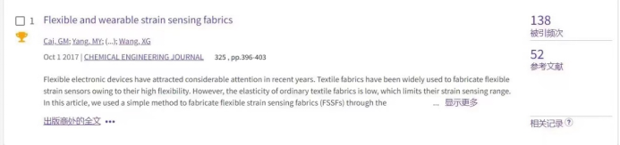 近期,根据ESI(基本科学指标数据库)最新数据显示,公司蔡光明教授2017年发表于化工领域TOP期刊Chemical Engineering Journal的研究成果《Flexible and wearable strain sensing fabrics》入选了由Web of Science识别的高被引论文。该论文以best365英国体育在线为第一完成单位,蔡光明教授为第一作者,该论文被引138次。