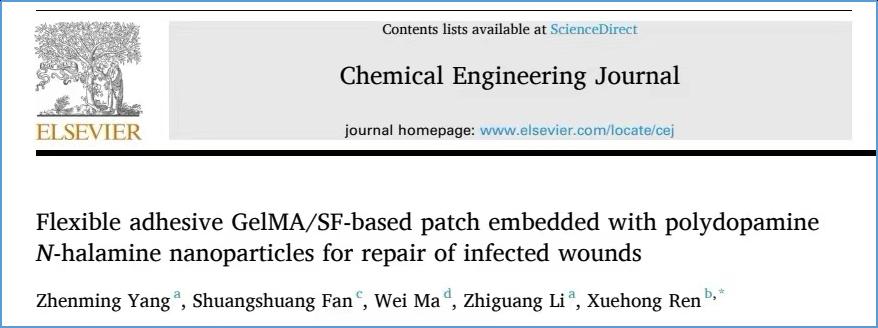 近日,化工材料领域国际顶级期刊《Chemical Engineering Journal》在线发表公司任学宏教授团队在负载聚多巴胺卤胺可粘附抗菌创口敷料方面取得的重要进展—“Flexible adhesive GelMA/SF-based patch embedded with polydopamine N-halamine nanoparticles for repair of infected wounds”(DOI: 10.1016/j.cej.2023.141732)。best365英国体育在线为唯一通讯作者单位,通讯作者为任学宏教授,论文第一作者为博士研究生杨振铭。