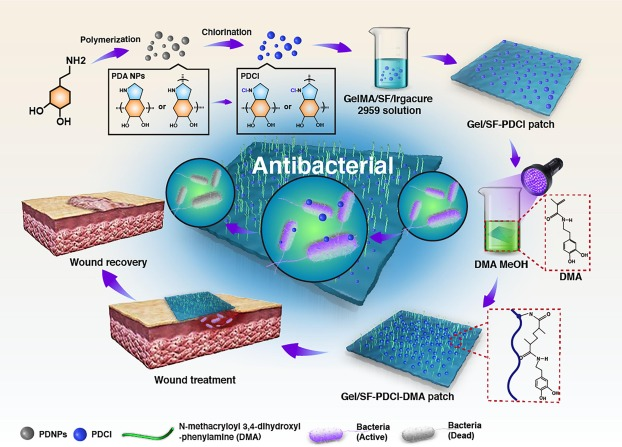 基于此,任学宏教授团队设计了一种兼具抗菌及粘附性能的多功能创口敷料。该工作首次将聚多巴胺卤胺纳米颗粒(PDCl)作为抗菌组分,负载到明胶甲基丙烯酰(GelMA)/丝素蛋白(SF)基质中,同时使用多巴胺甲基丙烯酰胺(DMA)处理敷料以赋予GelMA/SF-PDCl-DMA敷料合适的粘附性能。