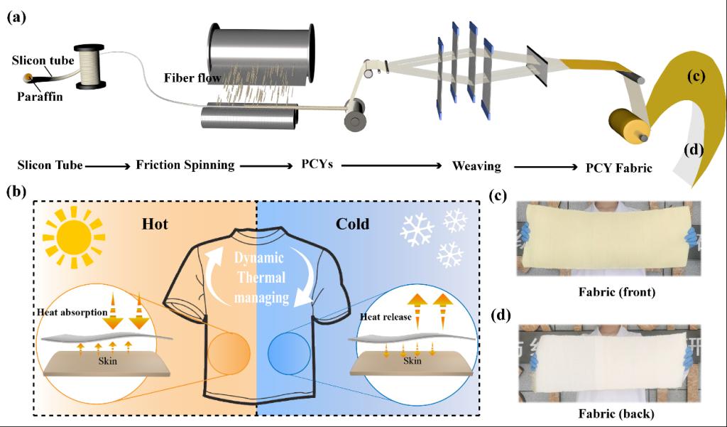 热管理和超高防护纺织品对极地科学家、宇航员和消防员至关重要。然而,大规模制造耐用热管理、超高热防护的包芯纱线仍是一个挑战。近期,best365英国体育在线徐卫林院士团队的夏治刚教授课题组,携手华中科技大学苏彬教授,创新提出液流纺制备一种基于石蜡的包芯纱(图1),实现了热管理纱线的批量化生产,用于极端温度和热防护。