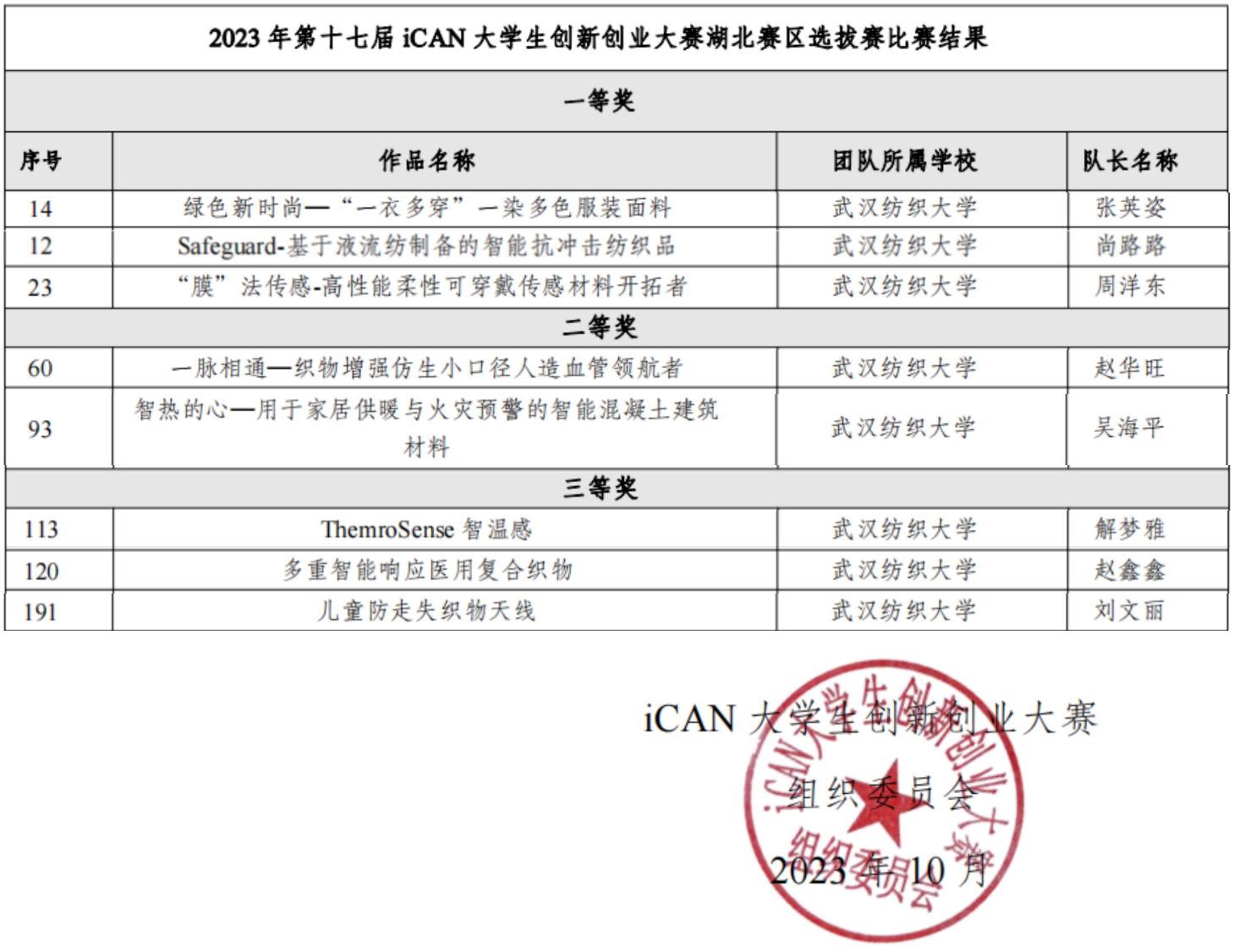 10月19日,iCAN老员工创新创业大赛组织委员会发布了《关于公布第十七届iCAN老员工创新创业大赛湖北赛区选拔赛结果的通知》(组委会发[2023]62号),公司夏治刚、于志财、庄燕、范玲玲、李岱祺、程德山等老师指导的团队表现不俗,获得省一等奖3个,省二等奖2个,省三等奖3个,成绩斐然!