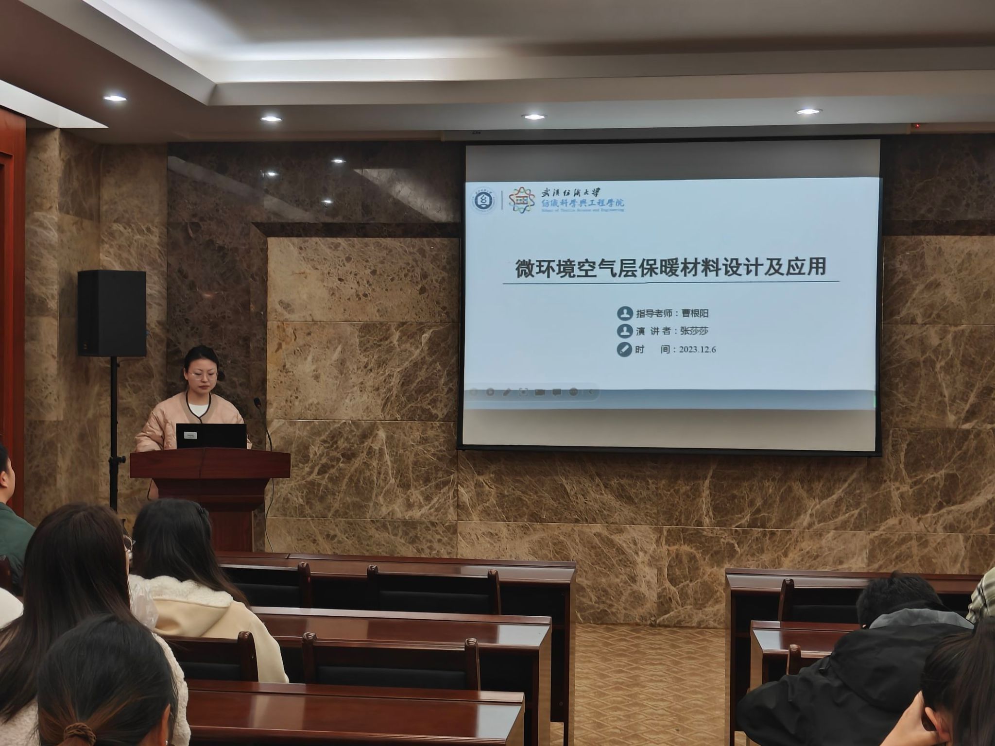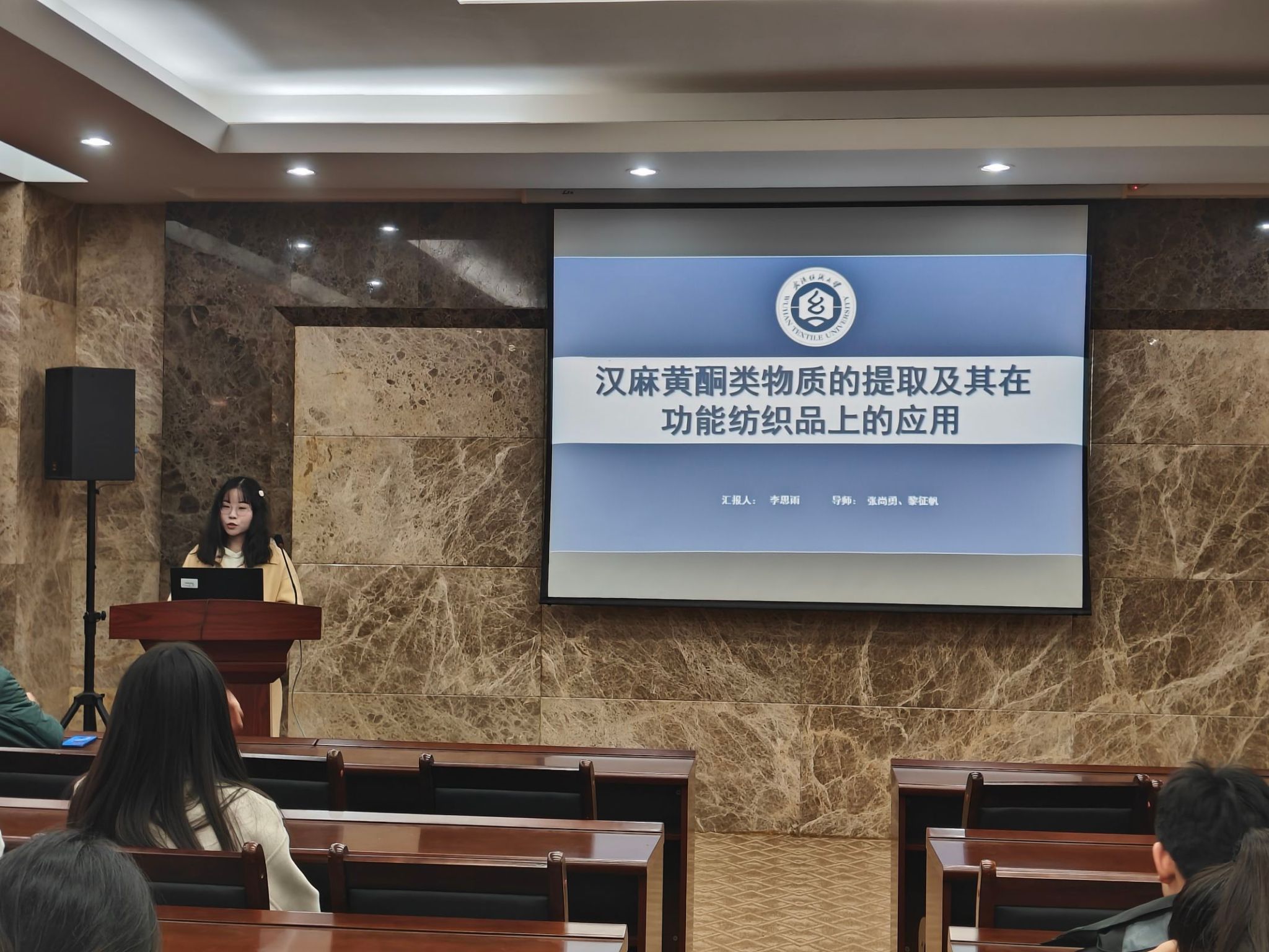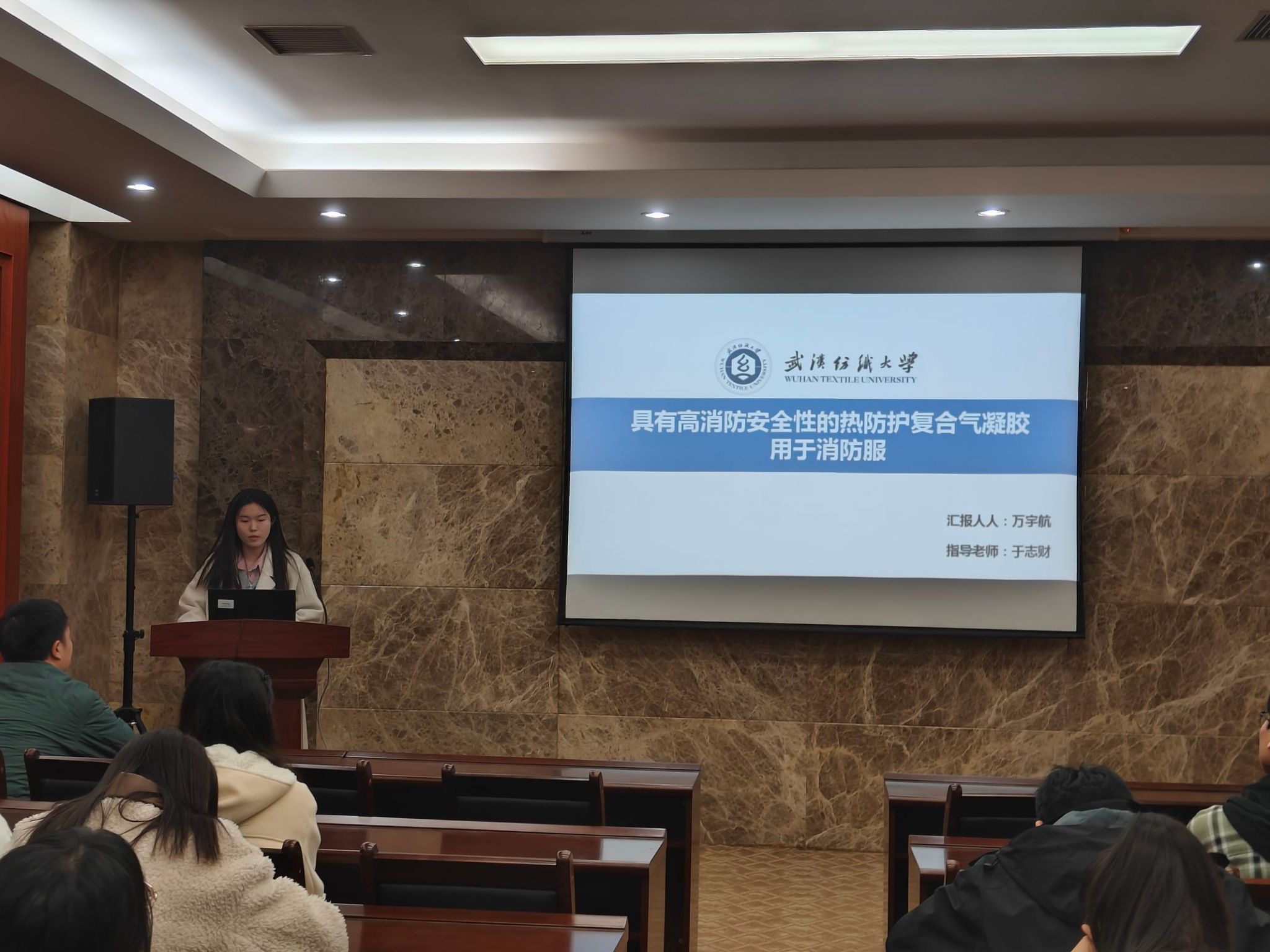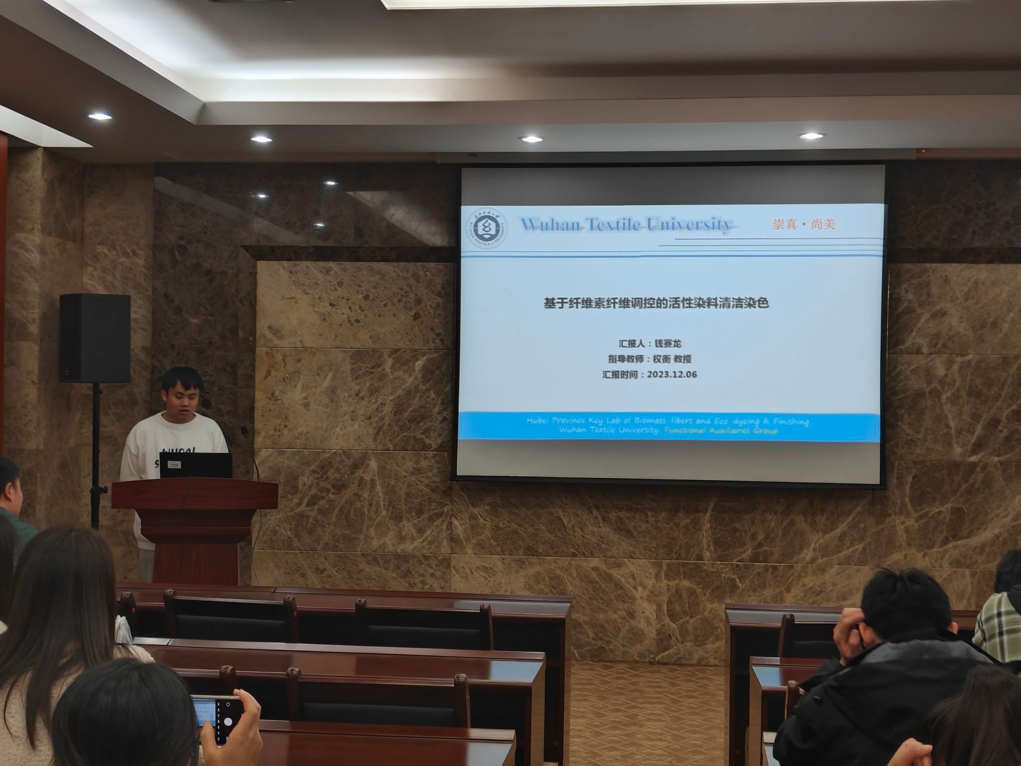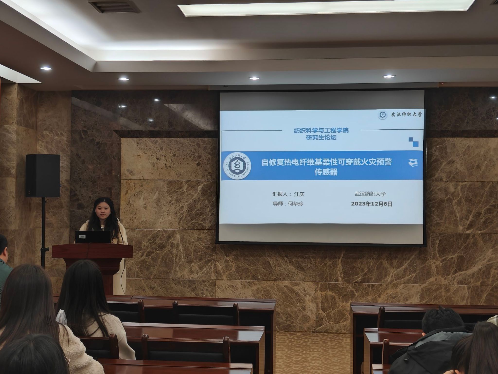 论坛上,李思雨、江庆、钱赛龙、万宇航、张莎莎五位同学依次介绍了自己的研究课题和目前取得的研究进展,并分享了自己的科研经验。主讲同学的研究课题包括汉麻黄酮类物质的提取及其在功能纺织品上的应用、自修复热电纤维基柔性可穿戴火灾预警传感器、基于纤维素纤维调控的活性染料清洁染色、具有高消防安全性的热防护复合气凝胶用于消防服、微环境空气层保暖材料设计及应用,契合了“纺织新材料及绿色加工”主题,代表了公司最新研究进展,参会人员积极提出问题和建议,营造了良好的学术氛围。