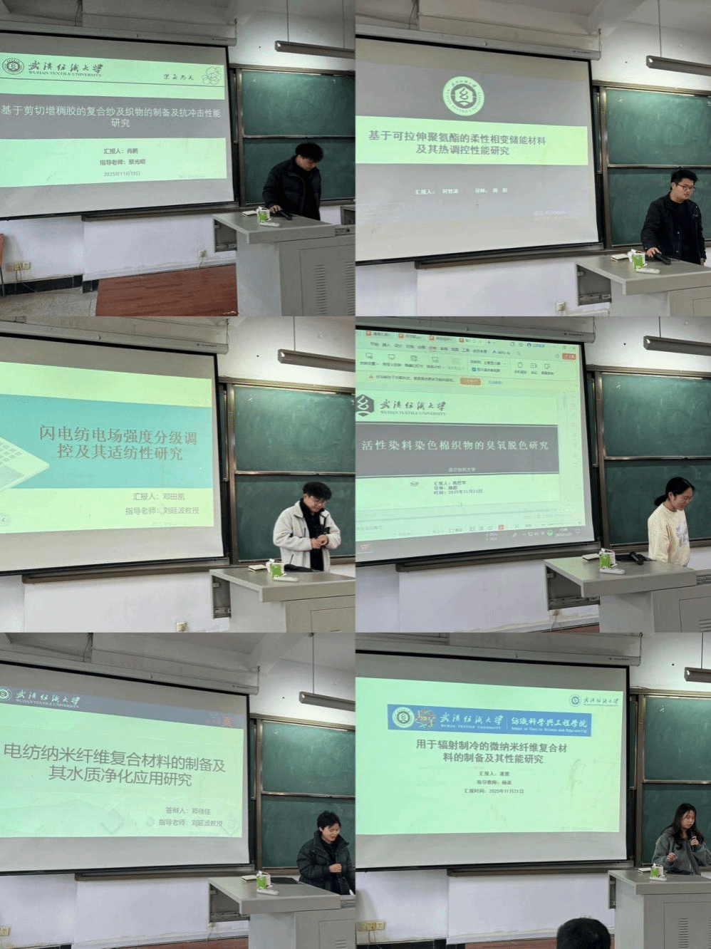 论坛上,邓田凯、郑佳佳、陈思琴、潘慧、何智涛、肖鹏六位同学依次介绍了自己的研究课题和目前取得的研究进展,并分享了自己的科研经验。主讲同学的研究课题包括闪电纺丝过程中电场强度分级调控及其适纺性研究、电纺纳米纤维复合材料的制备及其水质净化应用研究、活性染料染色棉织物的臭氧脱色研究、用于辐射制冷的微纳米纤维复合材料的制备及其性能研究、基于可拉伸聚氨酯的柔性相变储能材料及其热调控性性能研究、基于剪切增稠剂的复合纱及织物制备与抗冲击性能研究,契合了“纺织新材料及绿色加工”主题,代表了公司最新研究进展,参会人员积极提出问题和建议,营造了良好的学术氛围。