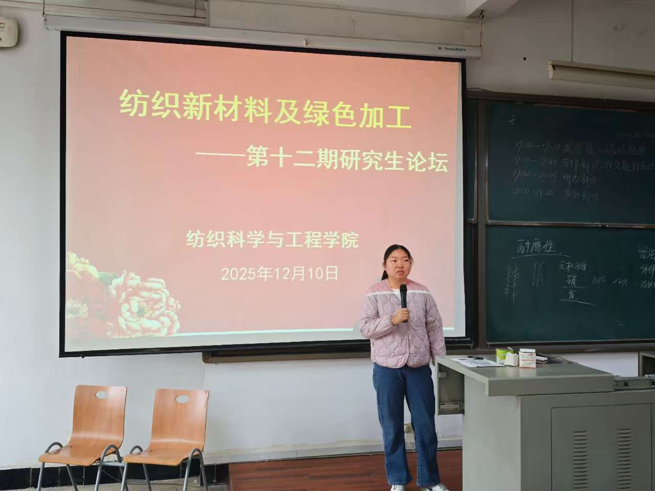 首先,肖杏芳老师介绍了举办研究生论坛的主旨和意义,同时宣布第十二期“纺织新材料及绿色加工”研究生论坛正式开始。