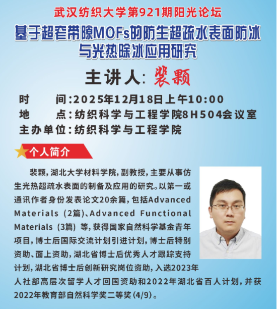 姜会钰首先介绍了裴颗副教授的科研、工作经历,并对裴颗副教授的出席表示了热烈欢迎。讲座中,裴颗副教授以“基于超窄带隙MOFs的防生超疏水表面防冰与光热除冰应用研究”为题,介绍了该课题的研究背景,并分享了他在防生超疏水表面防冰与光热除冰的研究进展,并对未来进行展望。交流中,裴颗副教授和参会的青年教师就构建具有多级微纳结构的仿生超疏水表面等问题进行了热烈的交流,为师生们答疑解惑,并为公司青年教师基金申报工作进行了指导和辅导,并祝公司在2026年基金申报工作中一帆风顺、满载而归。参会教生表示讲座内容干货满满、收获满满。最后,参会师生对裴颗副教授表示了诚挚感谢。