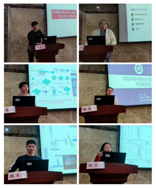 论坛上,洪焱、刘宛瑾、王凯、曾珍、夏咏和杨慧六位同学分别介绍了自己的研究课题和目前取得的研究进展,并分享了自己的科研经验。主讲同学的研究课题涵盖了纤维素/纳米TiO2复合粉体、超吸附麻纤维、高回弹棉基纱线、可拉伸导电复合纱线、柔性纤维应变传感器、冠状动脉支架等方面,代表了公司最新研究进展,营造了良好的学术氛围。