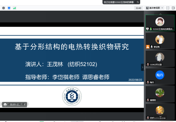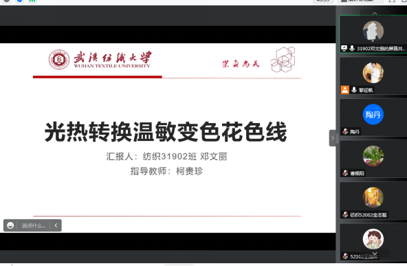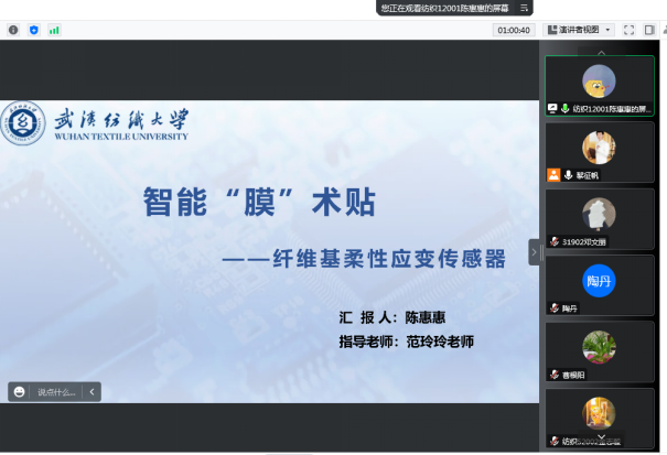 本次本科生学术论坛由公司4位本科生交流了课外科技成果 。纺织12001班陈惠惠汇报了纤维基柔性应变传感器的制备及其性能研究,项目获得“互联网加”老员工创新创业大赛湖北省金奖。纺织31902班邓文丽汇报了光热转换温敏变色花色线的研发,项目获得“前进杯” 中国高校牛仔面料设计大赛全国特等奖和“新澳杯”老员工纱线设计大赛全国一等奖。纺织52102班王茂林汇报了基于分形结构的电热转换织物的研究,项目获得“溢达杯”老员工创意大赛校一等奖。纺织52001班金志毅汇报了本征抗菌面料的开发及在内衣上的应用,项目获得“挑战杯”老员工创业计划大赛校铜奖。