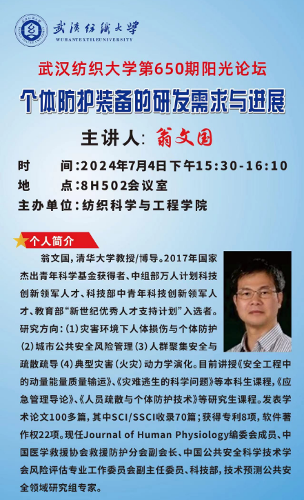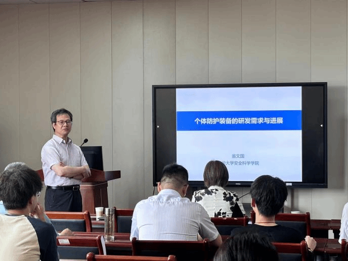 蔡光明教授首先介绍了翁教授的科研、工作经历,并对翁教授的出席表示了热烈欢迎。讲座中,翁教授以“个体防护装备的研发需求与进展”为题介绍了该课题的研究背景,并分享了最近研发防护装备的最新进展以及未来研发的需求。关于如何设计和制造个体防护装备,以进一步改善其结构/功能特性,翁教授提出通过研究:(1)灾害环境下人体损伤与个体防护(2)城市公共安全风险管理(3)人群聚集安全与疏散疏导(4)典型灾害(火灾)动力学演化等方面来研究防护装备性能的机制;翁教授介绍了灾难环境下人体损伤机理及个体防护原理;关于如何提高个体防护,翁教授展示了一种个体防护装备的人体工效学评价方法和性能检测平台及标准体系研究,用于轻柔高功效防护原理及复合功能织物的成形。翁教授和参会的师生就个体防护装备的研发需求进行了热烈的交流,为师生们答疑解惑。参会教生表示讲座内容干货满满、收获满满。最后,参会师生对翁教授表示了诚挚感谢。
