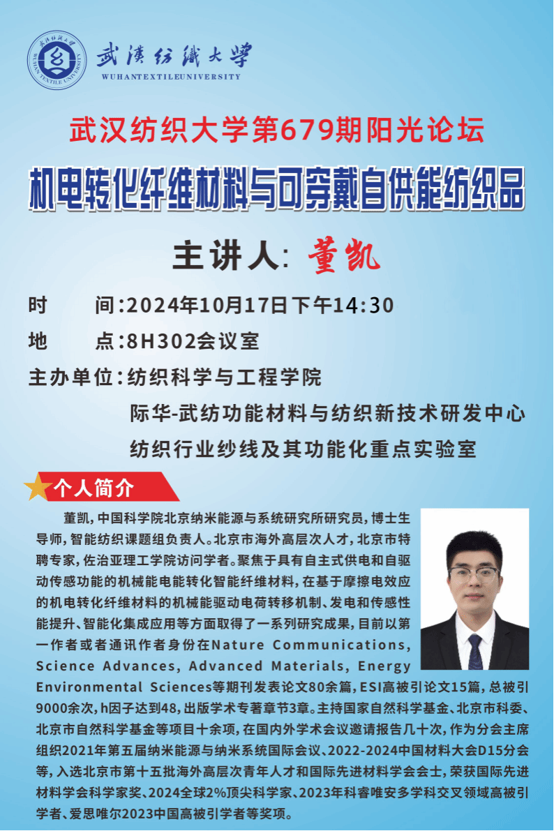 董凯,中国科公司北京纳米能源与系统研究所研究员,博士生导师,智能纺织课题组负责人。北京市海外高层次人才,北京市特聘专家,佐治亚理工公司访问学者。聚焦于具有自主式供电和自驱动传感功能的机械能电能转化智能纤维材料,在基于摩擦电效应的机电转化纤维材料的机械能驱动电荷转移机制、发电和传感性能提升、智能化集成应用等方面取得了一系列研究成果,目前以第一作者或者通讯作者身份在Nature Communications, Science Advances, Advanced Materials, Energy Environmental Sciences等期刊发表论文80余篇,ESI高被引论文15篇,总被引9000余次,h因子达到48,出版学术专著章节3章。主持国家自然科学基金、北京市科委、北京市自然科学基金等项目十余项,在国内外学术会议邀请报告几十次,作为分会主席组织2021年第五届纳米能源与纳米系统国际会议、2022-2024中国材料大会D15分会等,入选北京市第十五批海外高层次青年人才和国际先进材料学会会士,荣获国际先进材料学会科学家奖、2024全球2%顶尖科学家、2023年科睿唯安多学科交叉领域高被引学者、爱思唯尔2023中国高被引学者等奖项。
