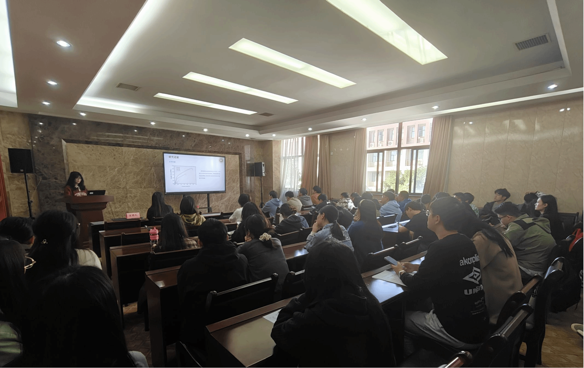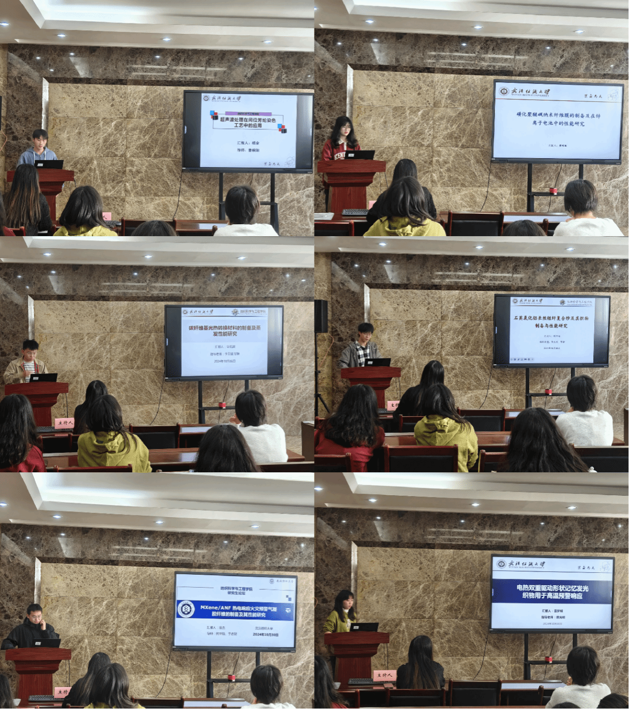 论坛上,杨余、廖明敏、华克润、陈千福、徐杰和雷梦蝶六位同学依次介绍了自己的研究课题和目前取得的研究进展,并分享了自己的科研经验。主讲同学的研究课题包括超声波处理、纳米纤维膜、碳纤维基光热转换材料、长丝短纤复合纱、气凝胶纤维、电热双重驱动形状记忆发光织物,契合了“纺织新材料及绿色加工”主题,代表了公司最新研究进展,参会人员积极提出问题和建议,营造了良好的学术氛围。