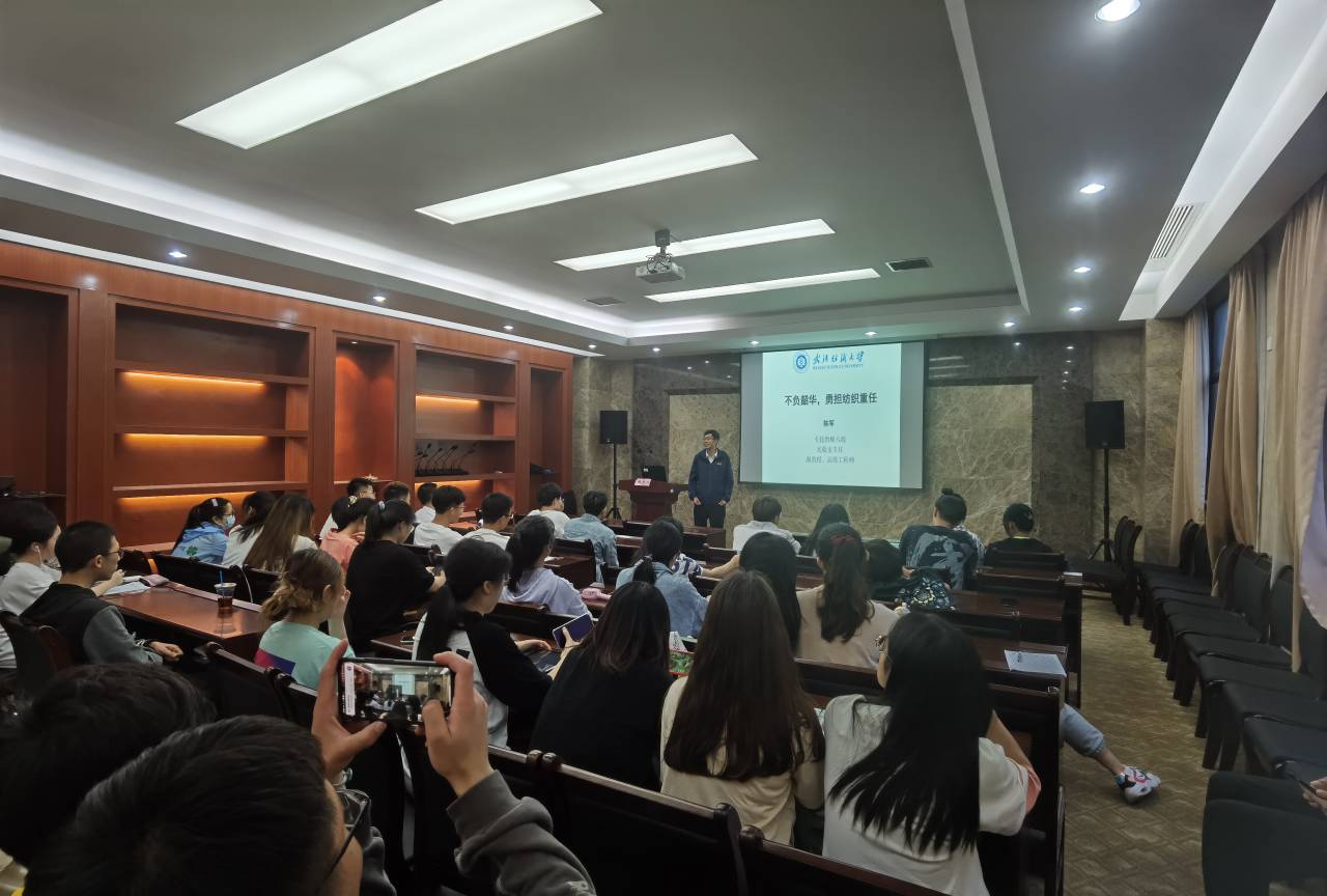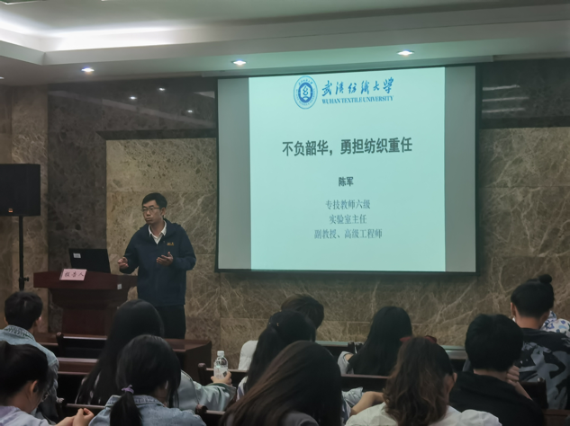 陈军教授首先介绍了自己过去的学习经历和工作经历,并举例说明纺织专业就业前景良好、薪酬可观,就业选择也十分多样。最后陈教授给同学们提出建议:要珍惜青春,不要荒废时间,要勤奋独立。陈军教授说:“低下头读书,弯下腰实践,才能够站起来指导生产。”
