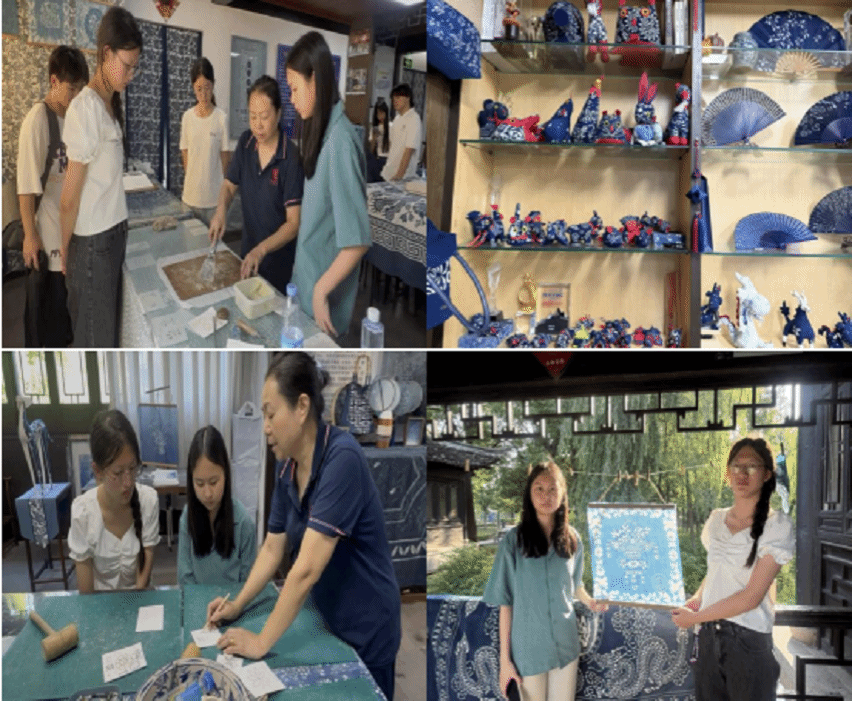 蓝白交织情意重,非遗瑰宝绽明珠。在南通蓝印花布博物馆,团队成员欣赏了一幅幅蓝白相间的蓝印花布作品,每一件都承载着浓郁的地方特色与民俗风情,尽显“蓝白相生、素花蕴雅”的功夫技艺和文化底蕴。在手工制作体验环节中,团队成员亲历蓝印花布的制作,体验道道工序:设计纹样、镂刻花版、刮浆防染、浸染染色、刮白显花、清洗晾晒,并学习了国家级非物质文化遗产“南通蓝印花布印染技艺”与“扎染技艺”。在亲手复刻“蓝白相生”的美学密码之时,实践团成员充分感受了南通土布的纹样之美,触摸到传统技艺与自然共生的智慧脉络。