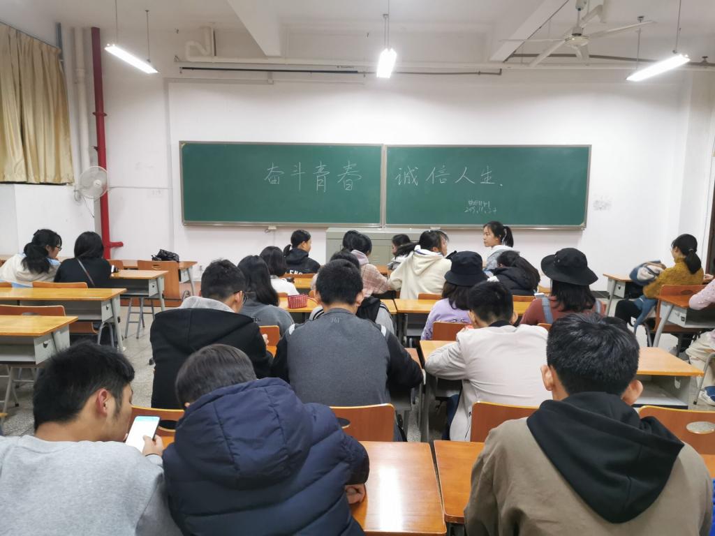 17级辅导员严蔷薇在班会上谈到,自古以来,考场上少不了的二字就是诚信,“诚信做人,诚信考试”,告诫大家一定要严肃考纪,不要触碰红线,切莫自欺欺人,做到知行合一,走出精彩人生。