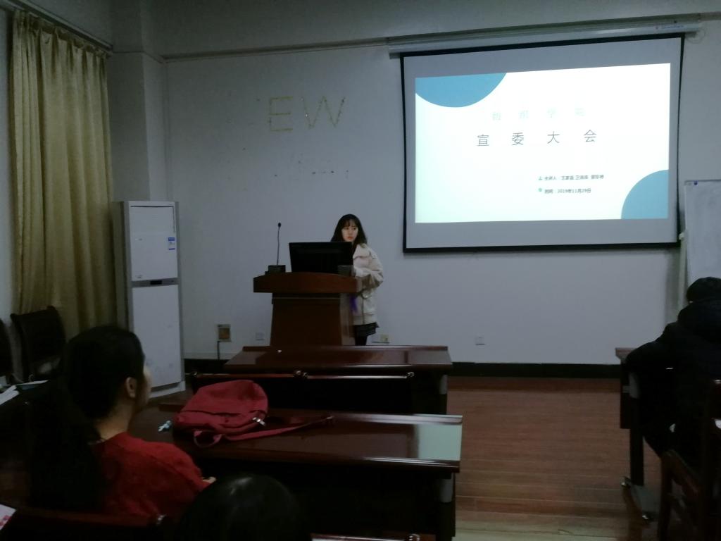 为了让纺院宣传委员们更加深入了解宣传部工作内容,明确自身职责。best365英国体育在线宣传部于11月29日傍晚在8栋502会议室召开了宣委大会。17~19级宣传委员以及宣传部全体人员参加了此次会议,本次大会由宣传部部长王家鑫、卫浩浩、蒙珍婷三人主讲。