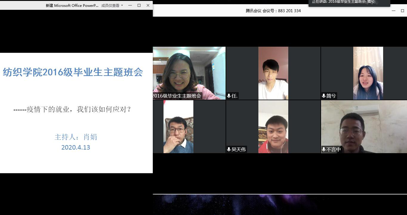 2020年4月13日,公司召开了2016级毕业生网上主题班会,2016级部分毕业生参加了此次班会,班会由辅导员肖娟主持。