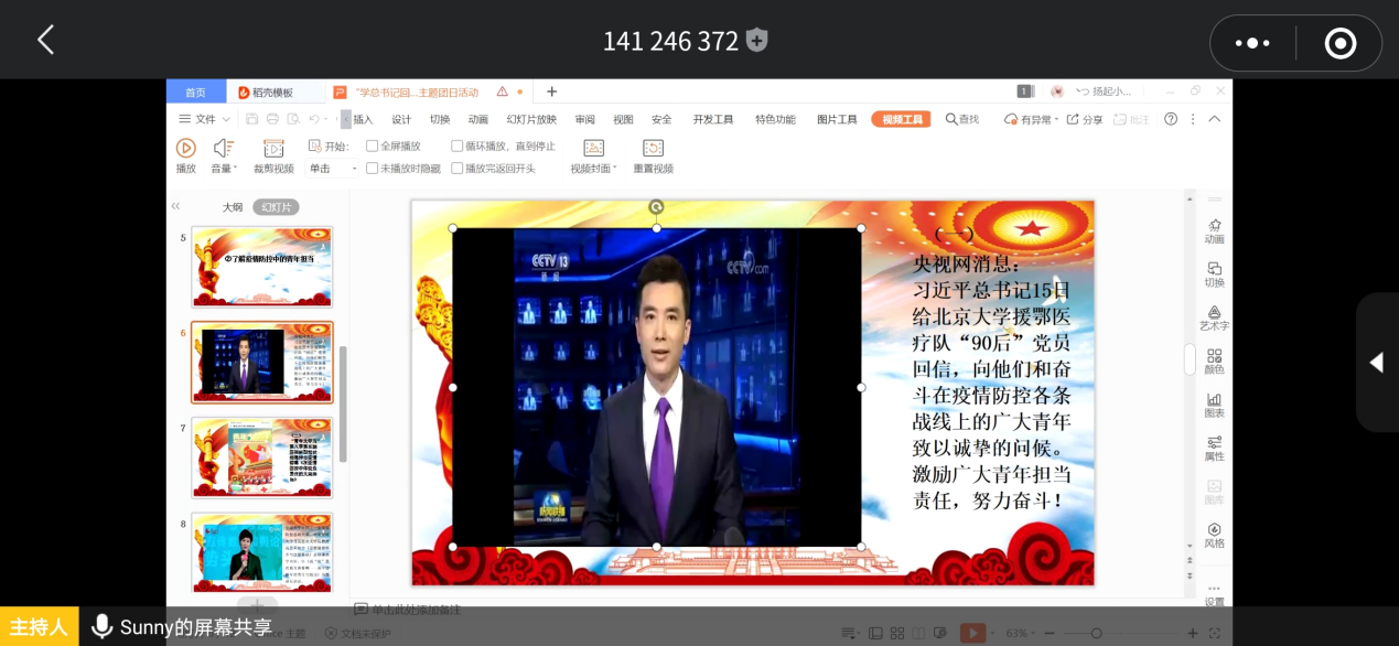会议伊始,主持人重温了习近平总书记给北京大学援鄂医疗队的回信,引导大家深入思考,指出这不仅是给援鄂医疗队党员的一封信,也是给广大青年的一封信。在信中,习近平总书记赞扬了在疫情一线奋战的青年党员,表达了国家对他们的期望,同时也为广大青年指明成长道路。