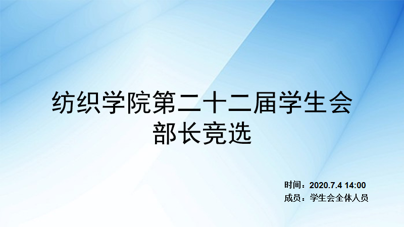 会议伊始,主持人曾鹏辉致开场词并宣布部长竞选正式开始。接着,文艺部、“金丝线”三创中心、办公室、体育部、志愿者协会、组织部、宿管会、纪检部、实践部、宣传部、织心湾共29位部长候选人逐一进行演讲。他们主要从个人介绍、工作经历、竞争优势、工作展望四个方面进行叙述,每位候选人都借用PPT的形式展示了自己的优点、回顾了一年以来的工作经历。自信从容的介绍自己在工作中的收获,提出对部门工作的看法与建议。演讲结束后,主席团成员对候选人进行提问,候选人从容不迫的根据问题表达自己的想法,竞选气氛也在候选人的发言中逐渐热烈。他们有条不紊的讲述自己对部门未来工作的展望,用坚定的信心表达了自己对纺院的热爱以及想继续为纺院贡献力量的想法。