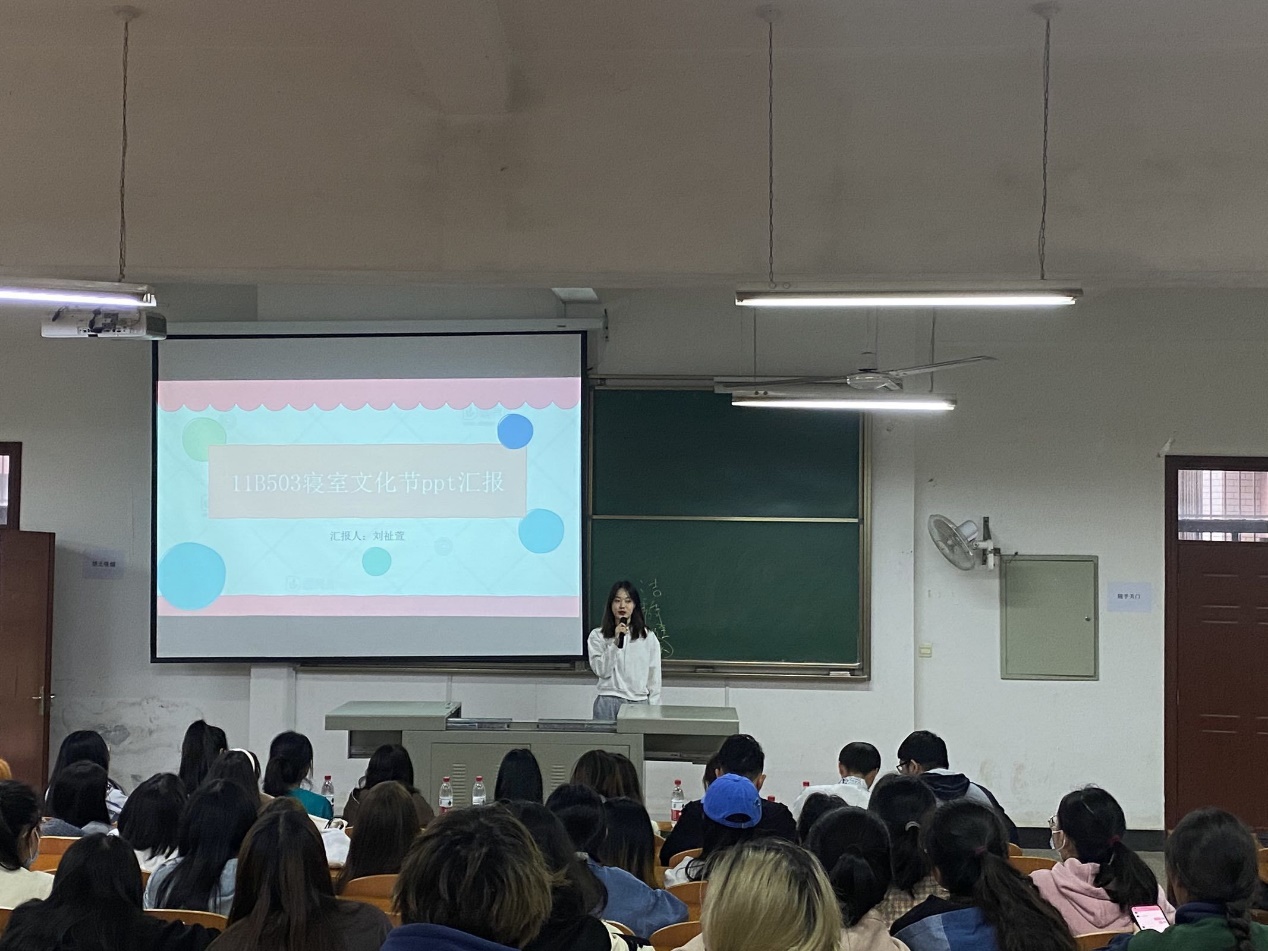 活动伊始,陈海副书记以“洁”、“静”、“雅”“美”为主题对宿舍优良氛围的重要性进行了详细阐释,提出希望纺院员工能够以宿舍为起点,营造良好的学风;张竣青老师则强调了此次寝室文化节活动目的和意义,并表示期待即将登场同学的精彩展示。接下来,各个寝室的代表开始对彰显自己寝室文化的专属PPT进行展示,内容包括寝室人员介绍、寝室日常生活、寝室学习和目标等方面,充分展现了各个宿舍不同的寝室风格,更展现了同学们远大的理想与目标。丰富的寝室文化让大家感受到了各个寝室成员积极向上的学习态度和他们对寝室生活的热情,同时也让大家体会到了舍友间真挚的友情和温馨的寝室氛围。