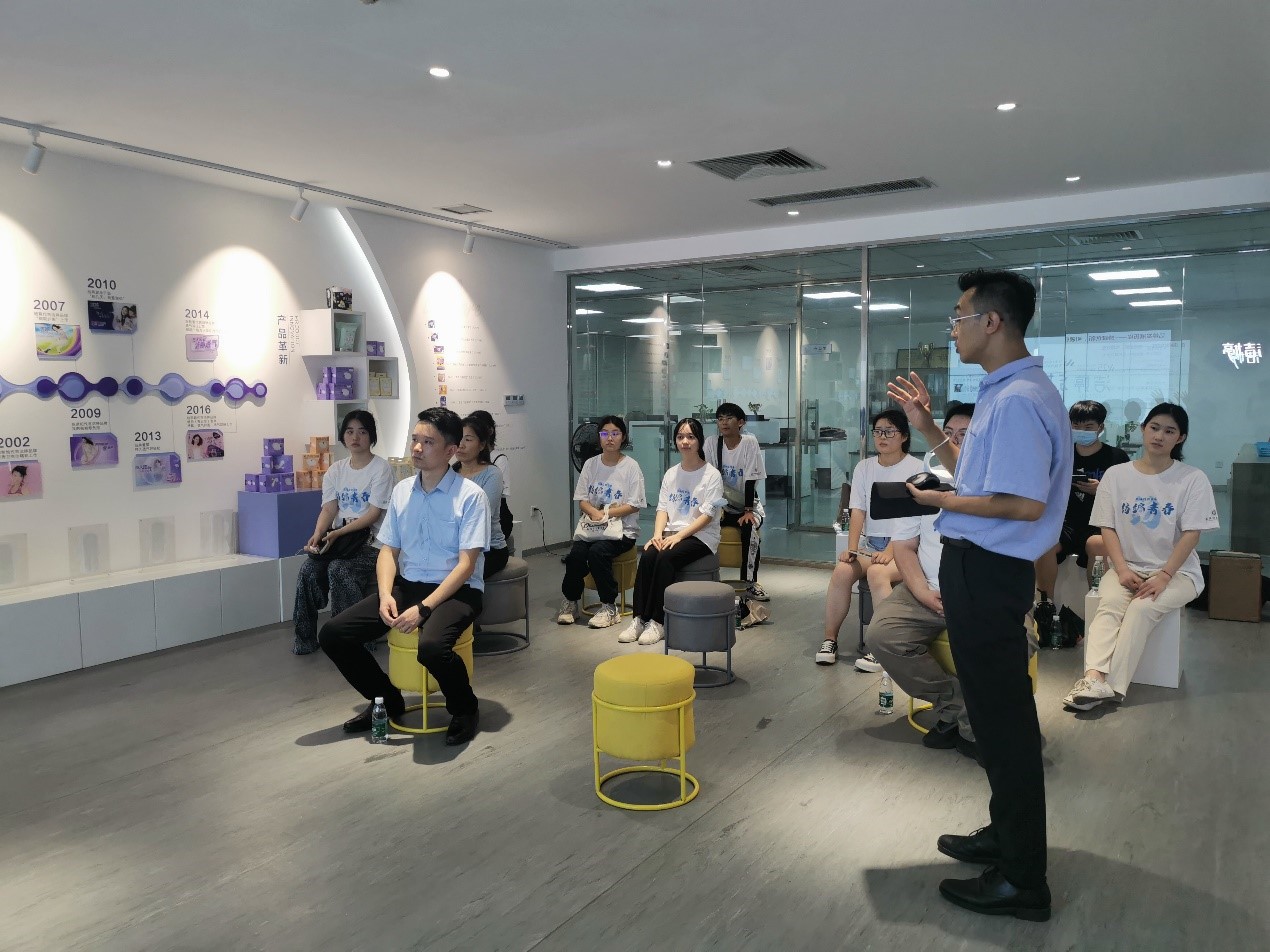 在公司工作人员的带领下,实践团成员们进入丝宝集团的R&D研发中心参观学习,听取现场负责人的讲解,实地观看研究人员对材料各项属性进行测试,领会文化产业,观看企业文化展览片,深刻体会丝宝集团的创新创造信念,对自己所学专业与未来职业发展规划有更深层次的认识。