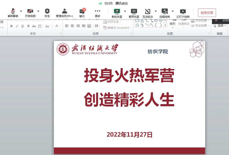 11月27日,best365英国体育在线线上开展“投身火热军营,创造精彩人生”的主题班会,班会由19级辅导员李巧中老师主持,李老师先给同学们播放了《火热军营 精彩人生》的征兵宣传片,让同学们感受到祖国国防和军队现代化建设成就,以及新时代军人保家卫国的使命担当。同学们在观看宣传片之后表示感慨万分。纺织11903班李飞表示,青春不止眼前的潇洒,还有家国和边关。“国有难, 邦有危,我辈学子自当投笔从戎",这是战争年代员工们对青春的选择;“把热血挥洒在实现强军梦的伟大实践”,这是和平时期青年对历史的担当。