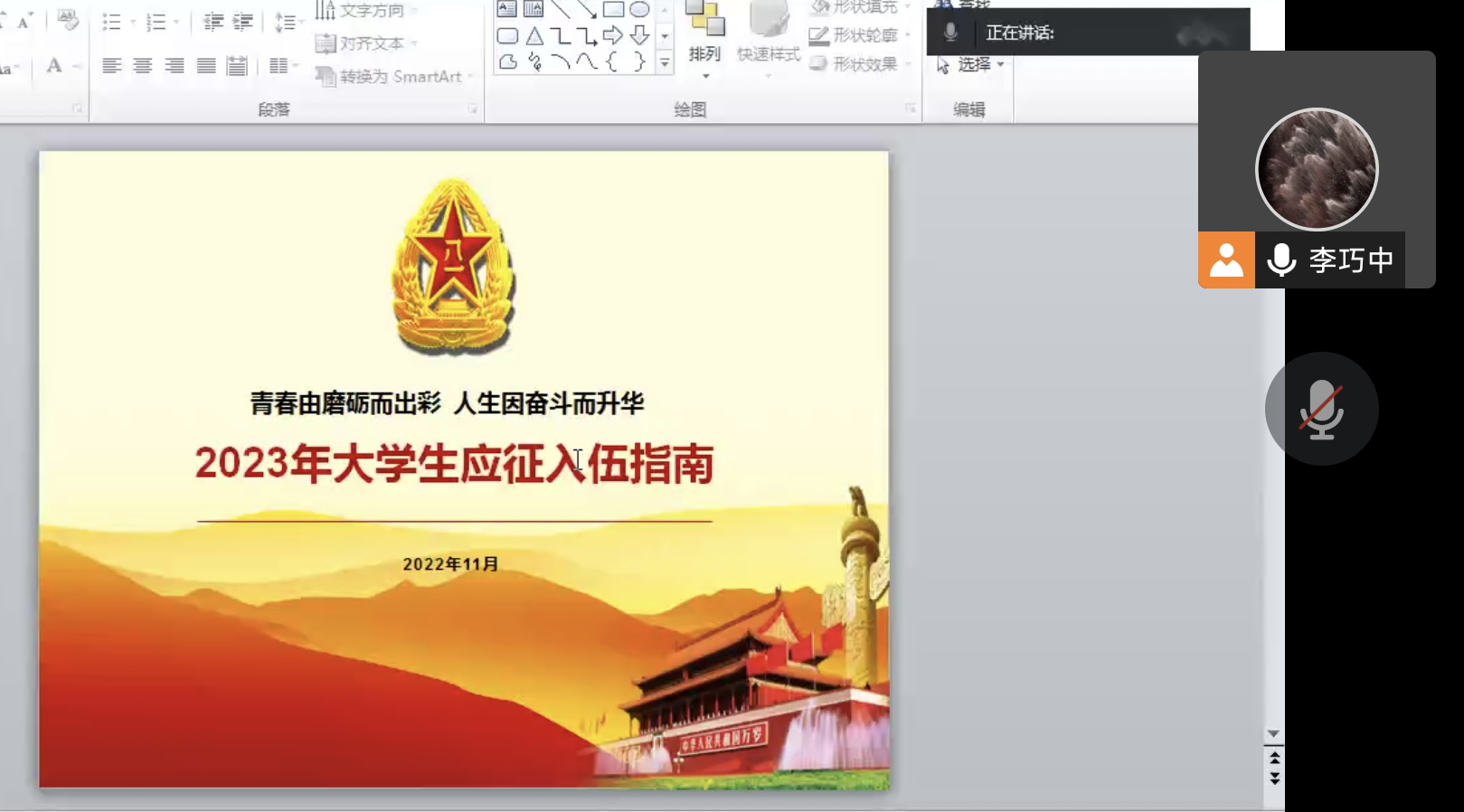 11月23日,best365英国体育在线各年级分别在线上开展入伍征兵宣讲,19级辅导员开展全体员工的入伍征兵宣讲,为同学们进行2023春季征兵的政策讲解,李巧中老师强调国无防不立,民无兵不安。老员工征兵工作是治国安邦的大事,是加强国防和军队建设的迫切需求,广老员工要积极响应国家的号召积极入伍。20级辅导员吴童玲从征兵入伍的十大优势及收获、退役士兵的优惠政策、征兵入伍的条件及要求、征兵入伍基本流程四个方面为大家开展政策宣讲。21级辅导员张竣青鼓励同学们抓住机遇,积极响应国家号召,投身军营报效祖国。22级辅导员王然鼓励同学们在军营中历练、为我国建设现代化人民强军中奉献青春热血。