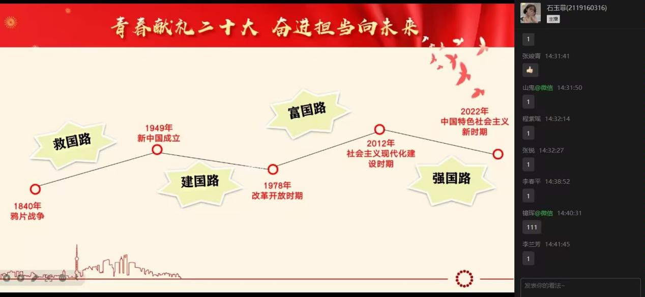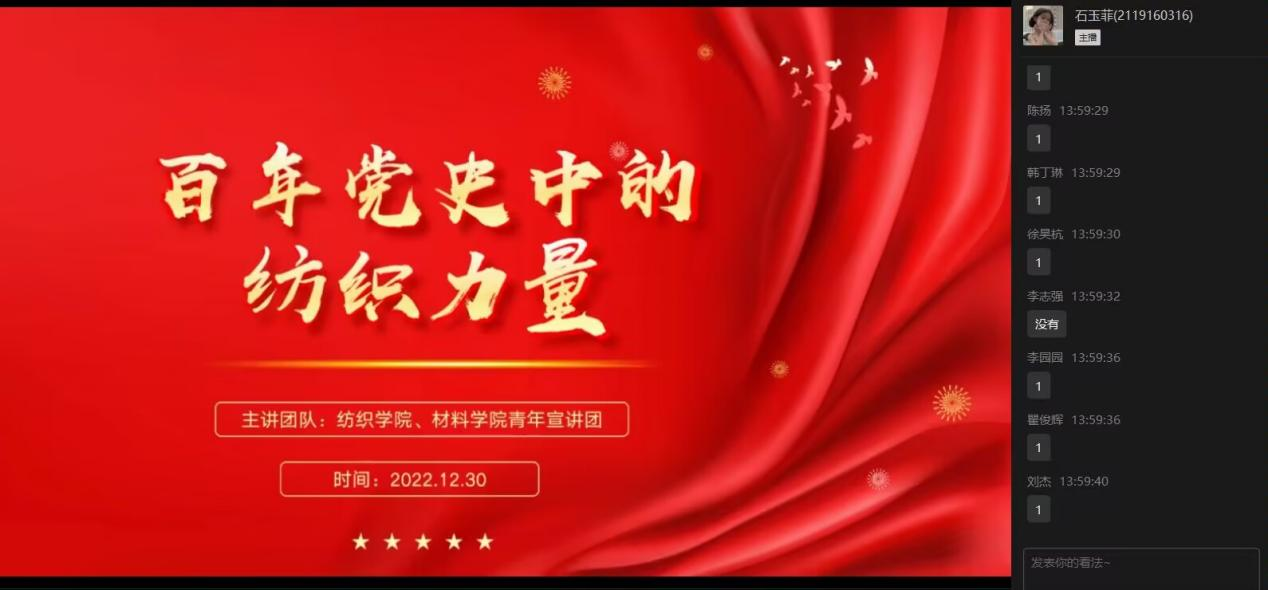 最后由石玉菲同学讲解了强国路上的纺织故事。从刀耕火种到高台大厦平地,科技创新发展是国家昌盛繁荣的动力源泉,她讲到当今世界正经历百年未有之大变局,中国坚持科技创新自立自强,既与自力更生自主创新的优良传统一脉相承,又积极融入世界开放共赢的历史潮流同频共振,其中纺织专业就为国家科技创新贡献了巨大力量!她介绍了公司取得的一系列科技成就:徐卫林院士团队研制的“织物版”五星红旗、天问一号探测器、人造血管;王栋教授对纳米纤维领域的发展做出的重要贡献;青年学子斩获挑战杯全国特等奖。号召青年矢志不渝、笃行不怠,让理想信念在前行奋斗中升华,让青春在尽责担当中闪光。