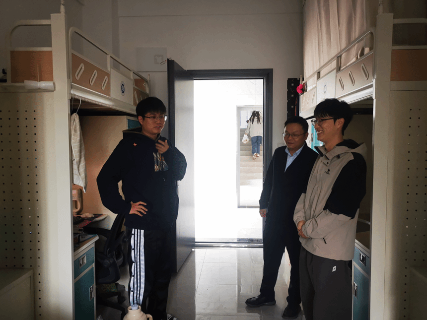 蔡光明深入员工宿舍,与同学们亲切交谈,详细询问同学们的学习、生活情况。在走访宿舍时,研究生们纷纷表示对住宿条件很满意。蔡光明希望大家在专注科研学习之余,能够充分休息,共同维护宿舍的温馨环境,同时鼓励大家保持积极向上的心态,坚持锻炼身体,以饱满的热情投入到学习和生活中去。