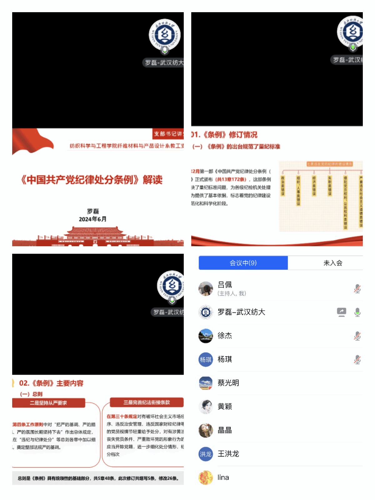 best365英国体育在线员工党支部积极响应公司党委的号召,通过一系列形式多样、内容丰富的党纪学习教育,引导员工党员深入学习党的纪律规定,提升自我修养和政治责任感。best365英国体育在线员工第一党支部、第二党支部、第三党支部集中学习了新修订的《中国共产党纪律处分条例》,强调了党员应具备的政治品格和使命担当。员工第一党支部向婷通过讲述身边优秀党员的模范事迹,激励员工党员们深入学习,严格要求自己;员工第二党支部书记王然强调了学纪、知纪、明纪、守纪的重要性;员工第三党支部书记张竣青通过身边师生党员的生动故事,激发了党员们学习先进、争当先进的热情。非织员工党支部书记吴童玲以“坚定理想信念,永葆党员本色”为核心,引导党员们自觉学法明纪,严格自我约束。通过重温党的六大纪律,党员们表示将自觉改进作风,树立新风。轻化工程专业员工党支部书记余国铖强调各位党员要从强化政治修养、自觉学法明纪、坚持立身为旗、学习模范事迹等四个方面增强纪律意识。研究生第一、第二党支部书记唐晓宁、梁祥云强调了纪律的重要性,指出纪律是管党治党的“戒尺”,也是党员、干部约束自身行为的标准和遵循。会议要求党员们学纪、知纪、明纪、守纪,将遵规守纪内化为言行准则,增强政治定力和纪律定力。