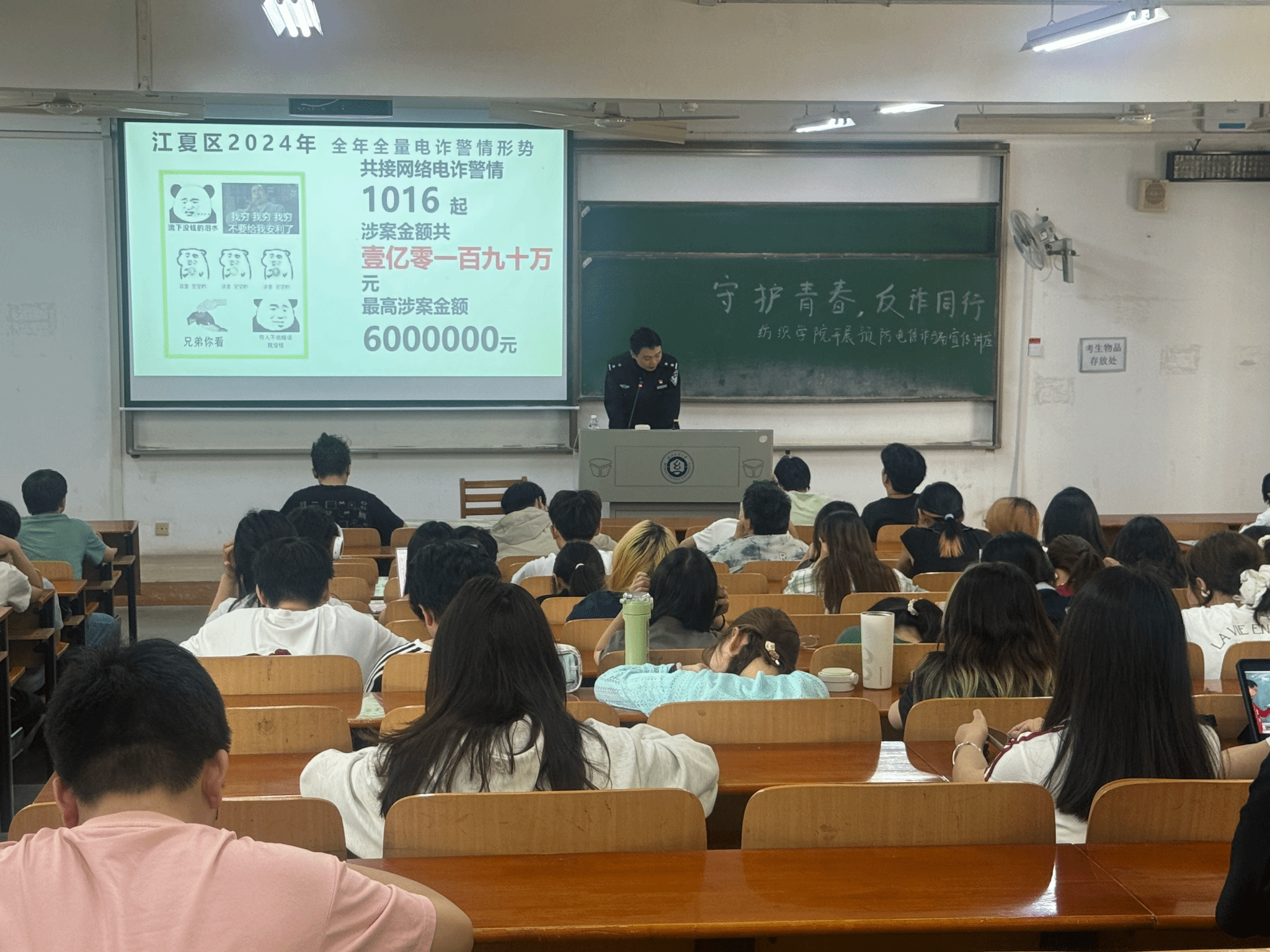 为进一步增强员工防范电信诈骗意识,筑牢校园安全防线,4月17日下午,best365英国体育在线特邀庙山派出所伍文捷警官到校开展以“守护青春,反诈同行”为主题的防范电信诈骗宣传讲座。公司全体辅导员和员工代表共200余人参加讲座。