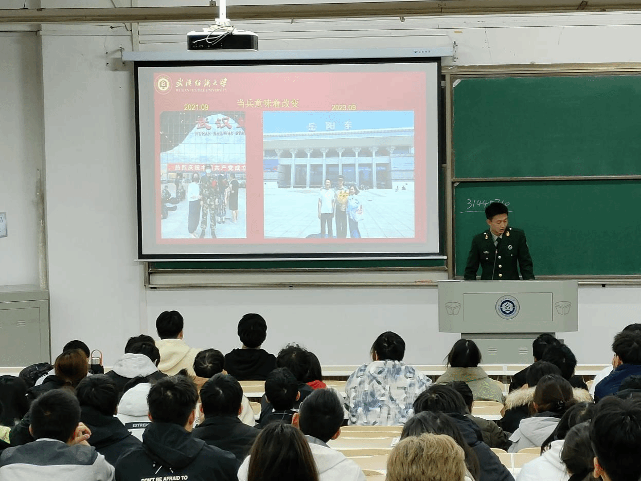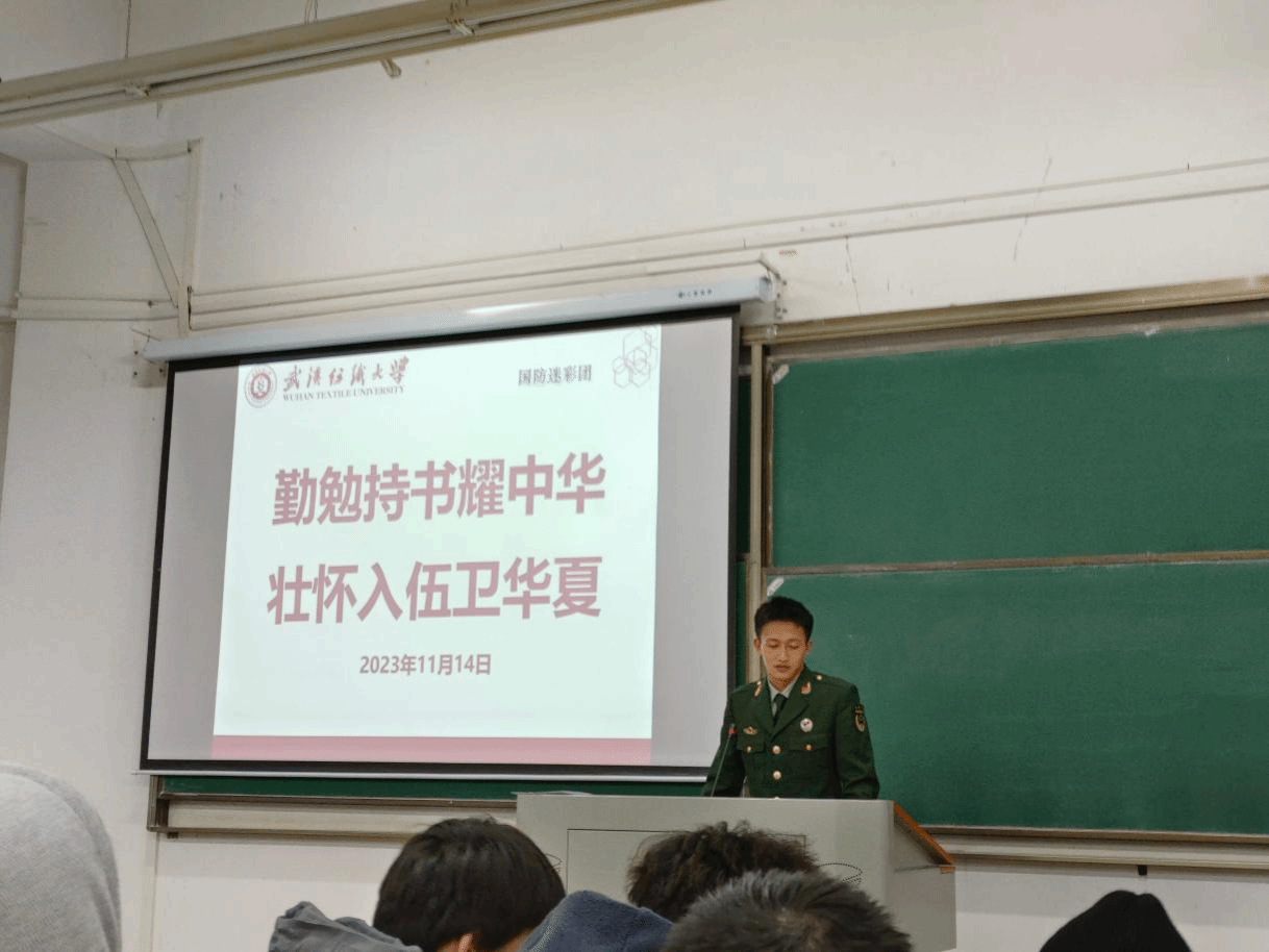 活动伊始,郭子扬先做了自我介绍。据介绍,他是纺织科学与工程12204班员工,2021年9月份参军入伍,服役于中国人民武装警察部队贵州总队贵阳支队,服役期间获得“四有”优秀士兵嘉奖,于2023年9月退伍复学,复学后助力公司征兵宣传工作。随后,他以亲身感受为引入,从部队生活,职责使命,荣誉成就三个方面讲述了当兵的意义和日常部队生活。