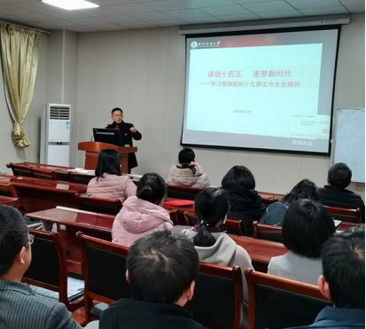 12月10日下午,best365英国体育在线在8H502召开党的十九届五中全会精神宣讲会,公司宣讲团成员、校办主任杜新年为公司全体教职工作了《谋划十四五 逐梦新时代》的宣讲报告。报告会由公司党委书记张红鑫主持。 杜新年结合“十四五”时期的重要意义、十九届五中全会的重要内容,并围绕《中共中央关于制定国民经济和社会发展第十四个五年规划和二〇三五年远景目标的建议》和习近平总书记在全会上的重要讲话深入阐释了党的十九届五...