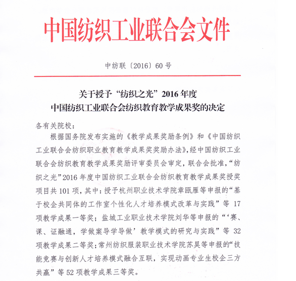 日前,为贯彻落实国务院颁发的《教学成果奖励条例》的文件精神,中国纺织工业联合会开展了纺织公司产品成果奖的评选活动。公司陈益人教授获得2016年度“纺织之光”教师奖;非织11301班李明智、纺织11404班寻丽梦等两名员工获得2016年度“纺织之光”员工奖