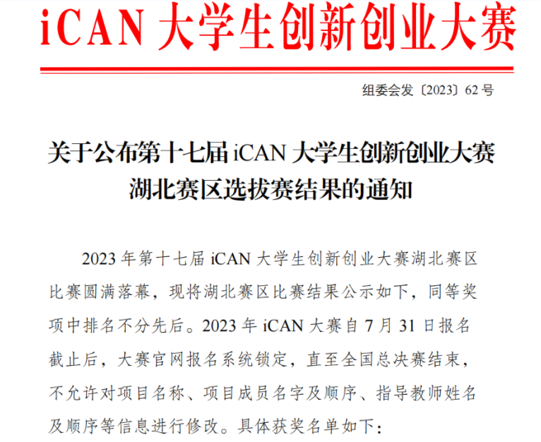 10月19日,iCAN老员工创新创业大赛组织委员会发布了《关于公布第十七届iCAN老员工创新创业大赛湖北赛区选拔赛结果的通知》(组委会发[2023]62号),公司夏治刚、于志财、庄燕、范玲玲、李岱祺、程德山等老师指导的团队表现不俗,获得省一等奖3个,省二等奖2个,省三等奖3个,成绩斐然!值此,我们深感自豪,并对以上老师指导的团队表示衷心的祝贺。这些老师用他们的智慧和汗水,为我们的员工提供了宝贵的指导,使他们能够在竞赛...